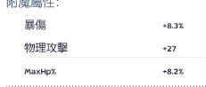 暴傷8.3% HP% 8.2% 物理攻擊27 1500T