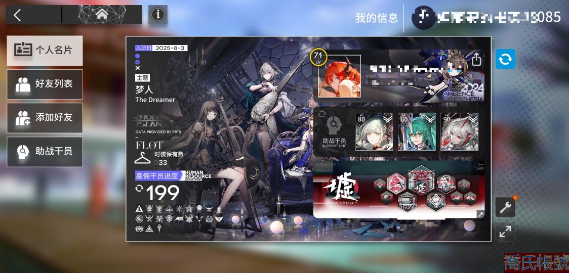 【OBMFICP387742】71級,32六星,16精二,3精一,合成玉數量:47835,源石數量:279,聯動幹員數量:5,時裝數量:33,精二六星:遙,塞雷婭,聖聆初雪,史爾特爾,酒神,艾雅法拉,瑪恩納,Mon3tr,萊伊,斬業星熊,銀灰,邏各斯,凜御銀灰,豐川祥子,娜仁圖亞,維什戴爾;精一六星:魔王,電弧,百鍊嘉維爾;六星幹員:遙,塞雷婭,聖聆初雪,史爾特爾,酒神,艾雅法拉,瑪恩納,Mon3tr,萊伊,斬業星熊,銀灰,邏各斯,凜御銀灰,豐川祥子,娜仁圖亞,維什戴爾,魔王,電弧,百鍊嘉維爾,溯光星源,弒君者,霍爾海雅,伺夜,能天使,黑,林,夜鶯,淬羽赫默,流明,推進之王,歌蕾蒂婭,嵯峨;聯動幹員:八幡海鈴,祐天寺若麥,三角初華,若葉睦,豐川祥子;時裝:遠路·瑪恩納,夏日餮宴·水月,繽紛奇境CW03·史爾特爾,焦點·傀影,綿絨小魔女·艾雅法拉,旋律的主人·豐川祥子,籠中歌者·三角初華,糖果暴擊·奧達,提線的本我·若葉睦,礫瓦·泥岩,相位面容·錫人,悠然假日HD71·寒檀,北地引路人·提豐,夏卉FA062·桃金娘,奇工妙想·星極,繪聲繪影·深海色,海岸救援改裝·Lancet-2,夏卉FA018·艾雅法拉,荒原行者·普羅旺斯,古堡清潔專家·阿消,鐵律·塞雷婭,探尋者SKm01·銀灰,十字郡·芬,威塞克斯的信件·玫蘭莎,小鬼當家·暗索,悠然假日HDm06·安賽爾;【官方賬號】補充以下六點......