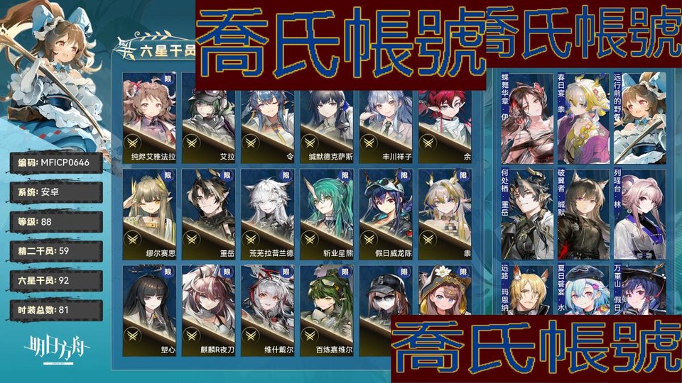 【OBMFICP064642】88級,92六星,59精二,3精一,合成玉數量:40,源石數量:0,聯動幹員數量:17,時裝數量:81,精二六星:傀影,鈴蘭,多蘿西,Mon3tr,焰影葦草,閃靈,遙,夜鶯,刻俄柏,艾雅法拉,林,純燼艾雅法拉,死芒,艾拉,聖聆初雪,令,緘默德克薩斯,澄閃,電弧,號角,銀灰,豐川祥子,餘,斥罪,焰尾,鴻雪,艾麗妮,琴柳,溫蒂,繆爾賽思,重嶽,萊伊,荒蕪拉普蘭德,赫德雷,伊內絲,烏爾比安,森蚺,斬業星熊,假日威龍陳,伊芙利特,黍,塑心,泥岩,琳琅詩懷雅,左樂,邏各斯,司霆驚蟄,瑪恩納,能天使,麒麟R夜刀,提豐,星熊,史爾特爾,維什戴爾,推進之王,薇薇安娜,棘刺,蕾繆安,百鍊嘉維爾;精一六星:流明,麥哲倫,伺夜;六星幹員:傀影,鈴蘭,多蘿西,Mon3tr,焰影葦草,閃靈,遙,夜鶯,刻俄柏,艾雅法拉,林,純燼艾雅法拉,死芒,艾拉,聖聆初雪,令,緘默德克薩斯,澄閃,電弧,號角,銀灰,豐川祥子,餘,斥罪,焰尾,鴻雪,艾麗妮,琴柳,溫蒂,繆爾賽思,重嶽,萊伊,荒蕪拉普蘭德,赫德雷,伊內絲,烏爾比安,森蚺,斬業星熊,假日威龍陳,伊芙利特,黍,塑心,泥岩,琳琅詩懷雅,左樂,邏各斯,司霆驚蟄,瑪恩納,能天使,麒麟R夜刀,提豐,星熊,史爾特爾,維什戴爾,推進之王,薇薇安娜,棘刺,蕾繆安,百鍊嘉維爾,流明,麥哲倫,伺夜,淬羽赫默,止頌,莫斯提馬,塞雷婭,滌火傑西卡,引星棘刺,瑕光,白鐵,弒君者,信仰攪拌機,黑,溯光星源,遠牙,歌蕾蒂婭,斯卡蒂,老鯉,靈知,燭煌,安潔莉娜,灰燼,煌,佩佩,魔王,忍冬,帕拉斯,霍爾海雅,陳,夕,山,風笛;聯動幹員:三角初華,八幡海鈴,艾拉,齊爾查克,祐天寺若麥,若葉睦,灰燼,豐川祥子,萊歐斯,森西,導火索,戰車,醫生,九色鹿,雙月,霜華,泰拉大陸調查團;時裝:蝶舞華章·伊內絲,春日宴·黍,遠行前的野餐·純燼艾雅法拉,何處棲·重嶽,破翼者·緘默德克薩斯,列瑤臺·林,遠路·瑪恩納,夏日餮宴·水月,萬重山·假日威龍陳,字句中的雪原·鴻雪,焦點·傀影,旋律的主人·豐川祥子,悠然假日HD29·安比爾,月下執行者·八幡海鈴,籠中歌者·三角初華,夏卉FA361·空,情熱魔術師·祐天寺若麥,提線的本我·若葉睦,糖果暴擊·奧達,家傳秘方·暴行,拭刀·刻刀,最初的頌歌·PhonoR-0,礫瓦·泥岩,相位面容·錫人,隨意而行·蘇蘇洛,悠然假日HD61·蜜蠟,地底三百米·暴行,從容時刻·翎羽,賀新禧·清流,密室·艾拉,悠然假日HD71·寒檀,晚間咖啡店·安賽爾,偶爾醉陶·斥罪,單刀·炎客,主修領域·地靈,星櫞林·流星,北地引路人·提豐,悠然假日HDm57·褐果,競技之夢改裝·正義騎士號,奇工妙想·星極,衣縷往昔·梓蘭,山川的釀造·帕拉斯,雪霽·鈴蘭,火樹靈·布丁,繪聲繪影·深海色,風雪邀請·史都華德,喜夜侍者·澄閃,遙鄉之徑·夏櫟,偽裝·宴,無痕行者·安德切爾,海岸救援改裝·Lancet-2,縱身一躍·傑克,悠然假日HD31·華法琳,安息處的怪盜·卡達,淺灘律動·藍毒,夏卉FA026·蘇蘇洛,古堡清潔專家·阿消,荒原行者·普羅旺斯,霜息·赫默,無形悼挽·獅蠍,見習聯結者·阿米婭,遺石·推進之王,皇后一號·風笛,幽靜·白麵鴞,威塞克斯的信件·玫蘭莎,快樂衛士·卡緹,報童·阿米婭,守歲人·芙蓉,小鬼當家·暗索,十字郡·芬,植物種志·調香師,悠然假日HDm06·安賽爾,辛味·末藥;【官方賬號】