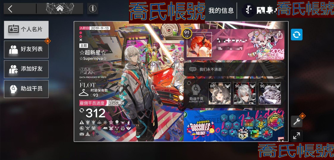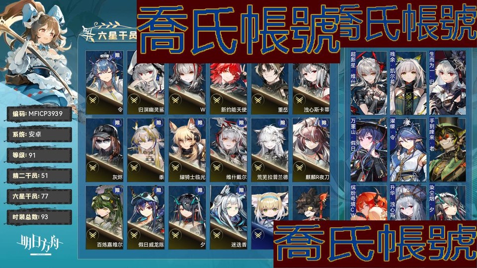 【OBMFICP393942】91級,77六星,51精二,12精一,合成玉數量:2,源石數量:1,聯動幹員數量:8,時裝數量:93,精二六星:鈴蘭,令,阿,艾麗妮,赫拉格,瑪恩納,推進之王,帕拉斯,夜鶯,史爾特爾,歸溟幽靈鯊,艾雅法拉,斥罪,W,新約能天使,重嶽,濁心斯卡蒂,鴻雪,斯卡蒂,溫蒂,星熊,灰燼,煌,伊內絲,黍,伊芙利特,棘刺,閃靈,林,傀影,塞雷婭,耀騎士臨光,泥岩,凱爾希,維什戴爾,麥哲倫,山,荒蕪拉普蘭德,焰影葦草,麒麟R夜刀,黑鍵,能天使,水月,百鍊嘉維爾,銀灰,假日威龍陳,夕,迷迭香,風笛,菲亞梅塔,陳;精一六星:早露,靈知,刻俄柏,白鐵,森蚺,霍爾海雅,老鯉,伺夜,嵯峨,流明,蕾繆安,歌蕾蒂婭;六星幹員:鈴蘭,令,阿,艾麗妮,赫拉格,瑪恩納,推進之王,帕拉斯,夜鶯,史爾特爾,歸溟幽靈鯊,艾雅法拉,斥罪,W,新約能天使,重嶽,濁心斯卡蒂,鴻雪,斯卡蒂,溫蒂,星熊,灰燼,煌,伊內絲,黍,伊芙利特,棘刺,閃靈,林,傀影,塞雷婭,耀騎士臨光,泥岩,凱爾希,維什戴爾,麥哲倫,山,荒蕪拉普蘭德,焰影葦草,麒麟R夜刀,黑鍵,能天使,水月,百鍊嘉維爾,銀灰,假日威龍陳,夕,迷迭香,風笛,菲亞梅塔,陳,早露,靈知,刻俄柏,白鐵,森蚺,霍爾海雅,老鯉,伺夜,嵯峨,流明,蕾繆安,歌蕾蒂婭,淬羽赫默,多蘿西,弒君者,卡涅利安,瑕光,燭煌,滌火傑西卡,信仰攪拌機,娜仁圖亞,安潔莉娜,琳琅詩懷雅,忍冬,止頌,薇薇安娜;聯動幹員:戰車,萊歐斯,醫生,齊爾查克,灰燼,九色鹿,羅小黑,泰拉大陸調查團;時裝:超新星·維什戴爾,殘餘·凱爾希,生而為一·歸溟幽靈鯊,萬重山·假日威龍陳,濯纓·令,手到牌來·老鯉,繽紛奇境CW03·史爾特爾,昇華·濁心斯卡蒂,染塵煙·夕,恍惚·W,家傳秘方·暴行,最初的頌歌·PhonoR-0,隨意而行·蘇蘇洛,地底三百米·暴行,主修領域·地靈,至聖誓言·菲亞梅塔,奇工妙想·星極,衣縷往昔·梓蘭,火樹靈·布丁,遙鄉之徑·夏櫟,繪聲繪影·深海色,風雪邀請·史都華德,組間休息·布洛卡,偽裝·宴,無痕行者·安德切爾,夏卉FA210·羽毛筆,超級斷罪朋友·斷罪者,幽谷奏鳴·石棉,海岸救援改裝·Lancet-2,破冰·霜葉,縱身一躍·傑克,未完成的禮物·豆苗,妙手玄心·阿,詩人的假日·流星,待晴日·深靛,傳承·帕拉斯,傑作·早露,安息處的怪盜·卡達,淺灘律動·藍毒,夏卉FA018·艾雅法拉,歧路幻影·赫拉格,悠然假日HD31·華法琳,愜意·棘刺,夏卉FA017·安潔莉娜,自由失效·史爾特爾,夏卉FA026·蘇蘇洛,烏雲·山,播種者·阿米婭,靜謐午夜DN06·泥岩,遊俠·灰燼,專業人士·斑點,霜息·赫默,荒原行者·普羅旺斯,孤寒峭·絮雨,鐵律·塞雷婭,尋耀·星極,探尋者SKm01·銀灰,滲透·伊桑,棄土花開·鈴蘭,古堡清潔專家·阿消,皇后一號·風笛,糖果仙子·溫蒂,八音蛋匠人·格雷伊,燦陽朝露SD01·臨光,見習聯結者·阿米婭,幽靜·白麵鴞,高原訪客·崖心,遺石·推進之王,燦陽朝露SD05·白金,無畏·米格魯,典雅噩兆·拉普蘭德,兒童派對·伊芙利特,歲紅霞·陳,無形悼挽·獅蠍,回味冰霜雪·麥哲倫,君子蘭·傑西卡,輓歌·夜鶯,未知的旅行·遠山,威塞克斯的信件·玫蘭莎,SUM019.ver·Castle-3,報童·阿米婭,光影·夜魔,靜謐午夜DN02·閃靈,小鬼當家·暗索,快樂衛士·卡緹,十字郡·芬,寒冬信使·德克薩斯,野地秘行·能天使,悠然假日HDm06·安賽爾,植物種志·調香師,辛味·末藥;【官方賬號】