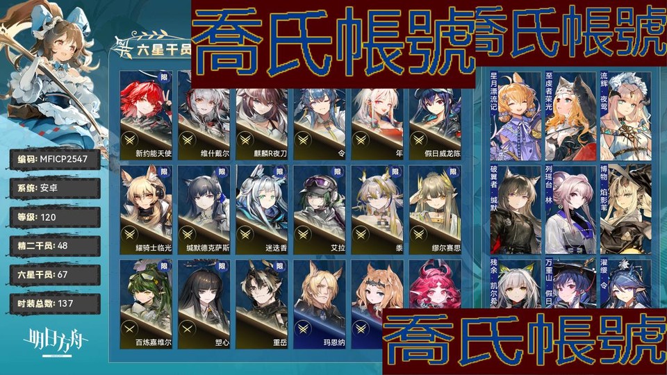 【OBMFICP254742】120級,67六星,48精二,2精一,合成玉數量:4414,源石數量:27,聯動幹員數量:15,時裝數量:137,精二六星:瑪恩納,空弦,妮芙,萊伊,林,星熊,提豐,號角,鴻雪,遠牙,新約能天使,維什戴爾,麒麟R夜刀,邏各斯,伊內絲,黑,傀影,蕾繆安,煌,令,薇薇安娜,年,假日威龍陳,艾麗妮,銀灰,早露,耀騎士臨光,緘默德克薩斯,烏爾比安,能天使,斯卡蒂,娜仁圖亞,風笛,黑鍵,迷迭香,艾拉,老鯉,黍,歌蕾蒂婭,靈知,莫斯提馬,流明,繆爾賽思,菲亞梅塔,凱爾希,伊芙利特,焰影葦草,刻俄柏;精一六星:百鍊嘉維爾,塑心;六星幹員:瑪恩納,空弦,妮芙,萊伊,林,星熊,提豐,號角,鴻雪,遠牙,新約能天使,維什戴爾,麒麟R夜刀,邏各斯,伊內絲,黑,傀影,蕾繆安,煌,令,薇薇安娜,年,假日威龍陳,艾麗妮,銀灰,早露,耀騎士臨光,緘默德克薩斯,烏爾比安,能天使,斯卡蒂,娜仁圖亞,風笛,黑鍵,迷迭香,艾拉,老鯉,黍,歌蕾蒂婭,靈知,莫斯提馬,流明,繆爾賽思,菲亞梅塔,凱爾希,伊芙利特,焰影葦草,刻俄柏,百鍊嘉維爾,塑心,水月,斥罪,溫蒂,棘刺,卡涅利安,琳琅詩懷雅,淬羽赫默,信仰攪拌機,泥岩,陳,史爾特爾,止頌,閃靈,伺夜,重嶽,魔王,澄閃;聯動幹員:霜華,導火索,戰車,齊爾查克,艾拉,萊歐斯,醫生,森西,祐天寺若麥,閃擊,三角初華,九色鹿,若葉睦,羅小黑,泰拉大陸調查團;時裝:星月漂流記·克洛絲,至虔者榮光·空弦,流輝·夜鶯,破翼者·緘默德克薩斯,列瑤臺·林,博物·焰影葦草,殘餘·凱爾希,萬重山·假日威龍陳,濯纓·令,夏日餮宴·水月,字句中的雪原·鴻雪,擁抱新生·迷迭香,焦點·傀影,染塵煙·夕,樂逍遙·年,糖果暴擊·奧達,家傳秘方·暴行,最初的頌歌·PhonoR-0,幻語樂痕·莫斯提馬,萬物有靈·懾砂,雙料四分衛·THRM-EX,地底三百米·暴行,悠然假日HD61·蜜蠟,密室·艾拉,伴青蓮·截雲,遠行的季節·松果,哀律西昂夜曲·藍毒,悠然假日HD71·寒檀,單刀·炎客,主修領域·地靈,星櫞林·流星,偶爾醉陶·斥罪,晴日·卡緹,北地引路人·提豐,悠然假日HD49·錫蘭,棠雲巧夢·子月,命運主宰·多蘿西,至聖誓言·菲亞梅塔,下一頓午茶·斯卡蒂,夏卉FA317·琴柳,幽邃隱修·絮雨,奇工妙想·星極,悠然假日HDm57·褐果,悠然假日HD29·安比爾,衣縷往昔·梓蘭,捉風·遠牙,山川的釀造·帕拉斯,廊下游·寒芒克洛絲,躍上街頭·泰拉大陸調查團,火樹靈·布丁,午夜郵差·能天使,繪聲繪影·深海色,未講述的故事·埃拉託,遙鄉之徑·夏櫟,風雪邀請·史都華德,組間休息·布洛卡,夏卉FA374·羅比菈塔,偽裝·宴,無痕行者·安德切爾,擁抱新生·迷迭香曾經,返航·歌蕾蒂婭,燦陽朝露SDm11·極境,小健將·焰尾,夏卉FA641·夜半,超級斷罪朋友·斷罪者,破冰·霜葉,幽谷奏鳴·石棉,先驅·靈知,未完成的禮物·豆苗,海岸救援改裝·Lancet-2,無拘無束·刻俄柏,妙手玄心·阿,霍恩洛厄的寒沙·卡涅利安,縱身一躍·傑克,紙板仙子·卡夫卡,待晴日·深靛,悠然假日HD31·華法琳,傑作·早露,異月災裔·瑕光,暗矢·安哲拉,魔城迴響·巫戀,宣傳策略·空弦,淡金慶典·桃金娘,詩人的假日·流星,殿堂上的遊禽·星極,傾聲歌唱·松果,安息處的怪盜·卡達,淺灘律動·藍毒,夏卉FA026·蘇蘇洛,夏卉FA017·安潔莉娜,輕風LB01·紅,自由失效·史爾特爾,靜謐午夜DN06·泥岩,白沙·蜜蠟,爆裂菲林·煌,荒原行者·普羅旺斯,遊俠·灰燼,天際線·黑,專業人士·斑點,鐵律·塞雷婭,古堡清潔專家·阿消,探尋者SKm01·銀灰,遠望·四月,夏卉FA333·刻俄柏,八音蛋匠人·格雷伊,燦陽朝露SD01·臨光,夢魘之夢·傀影,皇后一號·風笛,見習聯結者·阿米婭,無形悼挽·獅蠍,幽靜·白麵鴞,狩標浪人·星熊,遺石·推進之王,盛宴·華法琳,枯柏·守林人,小鬼當家·暗索,厚禮·黑,歲紅霞·陳,威塞克斯的信件·玫蘭莎,SUM019.ver·Castle-3,君子蘭·傑西卡,報童·阿米婭,未知的旅行·遠山,石墨·隕星,快樂衛士·卡緹,十字郡·芬,寒冬信使·德克薩斯,夏卉FA011·古米,暗流·幽靈鯊,靜謐午夜DN02·閃靈,悠然假日HDm06·安賽爾,野地秘行·能天使,孤攀客·崖心,植物種志·調香師,辛味·末藥;【官方賬號】便宜出,練度高,配隊多,皮膚多,有夜刀,羅小黑。還有挺多源石沒挖。號有換綁CD,要等兩個月才能換綁,我會幫忙換綁的