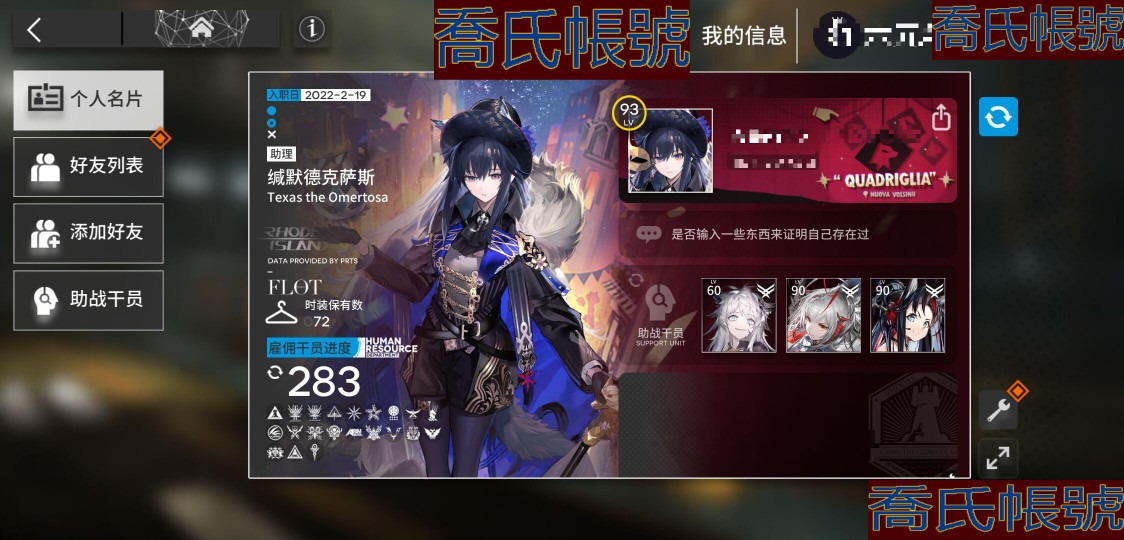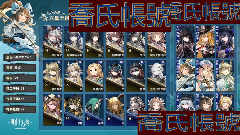【OBMFICP707142】93級,68六星,32精二,7精一,合成玉數量:13320,源石數量:46,聯動幹員數量:15,時裝數量:72,精二六星:老鯉,星熊,鐧,山,艾雅法拉,鴻雪,瑕光,能天使,維什戴爾,流明,夜鶯,邏各斯,推進之王,澄閃,鈴蘭,塞雷婭,伊芙利特,黑鍵,凱爾希,緘默德克薩斯,史爾特爾,棘刺,泥岩,塑心,號角,瑪恩納,麒麟R夜刀,阿斯卡綸,艾拉,風笛,煌,純燼艾雅法拉;精一六星:繆爾賽思,黍,靈知,白鐵,焰影葦草,娜仁圖亞,異客;六星幹員:老鯉,星熊,鐧,山,艾雅法拉,鴻雪,瑕光,能天使,維什戴爾,流明,夜鶯,邏各斯,推進之王,澄閃,鈴蘭,塞雷婭,伊芙利特,黑鍵,凱爾希,緘默德克薩斯,史爾特爾,棘刺,泥岩,塑心,號角,瑪恩納,麒麟R夜刀,阿斯卡綸,艾拉,風笛,煌,純燼艾雅法拉,繆爾賽思,黍,靈知,白鐵,焰影葦草,娜仁圖亞,異客,瑪露西爾,淬羽赫默,弒君者,夕,卡涅利安,林,妮芙,灰燼,麥哲倫,霍爾海雅,魔王,荒蕪拉普蘭德,赫德雷,歌蕾蒂婭,琴柳,帕拉斯,斥罪,維娜·維多利亞,斯卡蒂,薇薇安娜,左樂,止頌,佩佩,忍冬,仇白,溫蒂,伺夜,陳,艾麗妮;聯動幹員:瑪露西爾,齊爾查克,導火索,森西,萊歐斯,灰燼,醫生,戰車,艾拉,霜華,羅小黑,閃擊,雙月,九色鹿,泰拉大陸調查團;時裝:無我唯識·塑心,暗月的影子·鐧,幽蘭秘辛·緘默德克薩斯,遠行前的野餐·純燼艾雅法拉,流輝·夜鶯,新枝·繆爾賽思,紅女爵·濁心斯卡蒂,破翼者·緘默德克薩斯,遠路·瑪恩納,崖高夢遠·令,悠然假日HD26·百鍊嘉維爾,夏卉FA394·澄閃,殘餘·凱爾希,字句中的雪原·鴻雪,今昔須臾之夢·異客,繽紛奇境CW03·史爾特爾,隨意而行·蘇蘇洛,悠然假日HD61·蜜蠟,地底三百米·暴行,密室·艾拉,鋒潮·棘刺,晚間咖啡店·安賽爾,星櫞林·流星,觸及星辰·阿米婭,霜林醉·仇白,下一頓午茶·斯卡蒂,夏卉FA062·桃金娘,悠然假日HDm57·褐果,衣縷往昔·梓蘭,雪霽·鈴蘭,燦海浮夢·流明,火樹靈·布丁,遙鄉之徑·夏櫟,燈如晝·曉歌,繪聲繪影·深海色,風雪邀請·史都華德,偽裝·宴,歡唱之前·洛洛,夏卉FA210·羽毛筆,破冰·霜葉,黑曜石·泥岩,悠然假日HD31·華法琳,夏卉FA018·艾雅法拉,靜謐午夜DN06·泥岩,爆裂菲林·煌,愜意·棘刺,自由失效·史爾特爾,烏雲·山,霜息·赫默,皇后一號·風笛,棄土花開·鈴蘭,無形悼挽·獅蠍,堅城·塞雷婭,遺石·推進之王,典雅噩兆·拉普蘭德,幽靜·白麵鴞,輓歌·夜鶯,盛宴·華法琳,十字郡·芬,狩標浪人·星熊,報童·阿米婭,守歲人·芙蓉,野地秘行·能天使,四邊形·蛇屠箱,植物種志·調香師,悠然假日HDm06·安賽爾;【官方賬號】