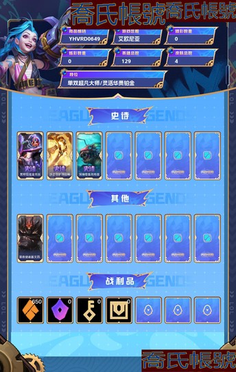 【OBYHVRD064942】129英雄/4皮膚總數(原皮+炫彩)/4皮膚/3史詩/ 單雙超凡大師/靈活華貴鉑金 賬號等級:60;雲頂之弈:0小小英雄/【史詩皮膚3】/黑幫狂花金克絲/沙之守護澤拉斯/深海怪魚克格莫【其他皮膚1】/黑夜使者嘉文四世 遊戲點券:0 神話精粹:0 藍色精萃:2011 橙色精粹:650 鑰匙:0 寶箱:0;0小小英雄, 【電信】 【艾歐尼亞】自創號,可自主申請峽谷,三頁連勝上的大師隱藏分正常,一把加23左右,段位號