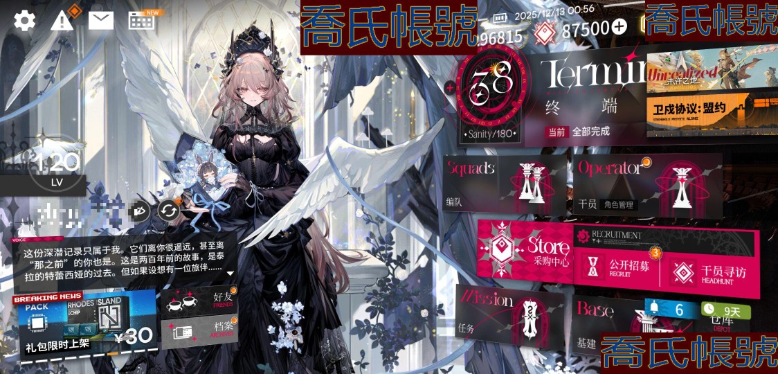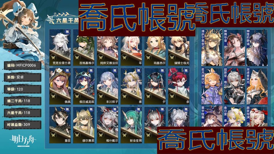 【OBMFICP000642】120級,118六星,118精二,0精一,合成玉數量:87500,源石數量:82,聯動幹員數量:20,時裝數量:309,精二六星:安潔莉娜,提豐,斯卡蒂,銀灰,真言,維娜·維多利亞,號角,仇白,山,荒蕪拉普蘭德,星熊,百鍊嘉維爾,司霆驚蟄,斥罪,鐧,遠牙,瑪恩納,燭煌,死芒,烏爾比安,伊芙利特,史爾特爾,刻俄柏,泥岩,聖約送葬人,林,邏各斯,淬羽赫默,赫德雷,純燼艾雅法拉,森蚺,妮芙,聖聆初雪,艾雅法拉,夜鶯,年,瑪露西爾,溯光星源,流明,Mon3tr,耀騎士臨光,佩佩,假日威龍陳,豐川祥子,琴柳,早露,黍,澄閃,夕,焰影葦草,空弦,閃靈,餘,卡涅利安,白鐵,莫斯提馬,塞雷婭,弒君者,棘刺,萊伊,麥哲倫,老鯉,重嶽,凱爾希,黑鍵,繆爾賽思,維什戴爾,滌火傑西卡,鴻雪,霍爾海雅,斬業星熊,伊內絲,歌蕾蒂婭,多蘿西,W,能天使,風笛,凜御銀灰,鈴蘭,魔王,陳,止頌,電弧,酒神,黑,瑕光,灰燼,帕拉斯,推進之王,信仰攪拌機,迷迭香,新約能天使,阿,阿斯卡綸,遙,娜仁圖亞,艾拉,濁心斯卡蒂,異客,令,靈知,塑心,伺夜,赫拉格,蕾繆安,菲亞梅塔,焰尾,傀影,麒麟R夜刀,水月,嵯峨,艾麗妮,緘默德克薩斯,溫蒂,引星棘刺,琳琅詩懷雅,煌,歸溟幽靈鯊;聯動幹員:齊爾查克,瑪露西爾,豐川祥子,八幡海鈴,灰燼,艾拉,九色鹿,戰車,醫生,祐天寺若麥,萊歐斯,導火索,三角初華,閃擊,若葉睦,森西,泰拉大陸調查團,羅小黑,雙月,霜華;時裝:漫步於黃金之夢·繆爾賽思,蝶舞華章·伊內絲,輝煌的靜謐·邏各斯,星月漂流記·克洛絲,超新星·維什戴爾,至虔者榮光·空弦,寰宇獨奏·阿米婭,春日宴·黍,霹靂導演·年,全能演員·重嶽,暗月的影子·鐧,無我唯識·塑心,眾志歸一·聖約送葬人,幽蘭秘辛·緘默德克薩斯,遠行前的野餐·純燼艾雅法拉,流輝·夜鶯,新枝·繆爾賽思,燃燒天穹下·伊內絲,不融冰·銀灰,紅女爵·濁心斯卡蒂,博物·焰影葦草,破翼者·緘默德克薩斯,何處棲·重嶽,列瑤臺·林,遠路·瑪恩納,崖高夢遠·令,悠然假日HD26·百鍊嘉維爾,夏卉FA394·澄閃,殘餘·凱爾希,生而為一·歸溟幽靈鯊,萬重山·假日威龍陳,夏日餮宴·水月,濯纓·令,字句中的雪原·鴻雪,手到牌來·老鯉,今昔須臾之夢·異客,復現榮光·耀騎士臨光,擁抱新生·迷迭香,繽紛奇境CW03·史爾特爾,焦點·傀影,昇華·濁心斯卡蒂,染塵煙·夕,樂逍遙·年,恍惚·W,悠然假日HD71·寒檀,一人車隊·賈維,綿絨小魔女·艾雅法拉,蒸汽尋蹤者·聖約送葬人,旋律的主人·豐川祥子,雨霓行遊客·流明,悠然假日HD29·安比爾,夏卉FA361·空,火種·火神,糖果暴擊·奧達,提線的本我·若葉睦,玩伴·紅雲,家傳秘方·暴行,永恆玩家·水月,空心王冠·白鐵,幻語樂痕·莫斯提馬,甜美配方·妮芙,蒼茫怒號·瑪恩納,拭刀·刻刀,最初的頌歌·PhonoR-0,寄自奧格尼斯科·薇薇安娜,封面傭兵·石英,審判日·菲亞梅塔,風笛聲聲·風笛,礫瓦·泥岩,玫瑰騎手·維荻,斜照·折光,夢幻高空·萊伊,相位面容·錫人,易爆藍焰·煌,魔女的鞦韆·泡普卡,至高判決·艾麗妮,雙料四分衛·THRM-EX,坊間涼茶鋪·老鯉,隨意而行·蘇蘇洛,棲息·淬羽赫默,泰拉冒險·瑪露西爾,花房茶話會·澄閃,我即潮汐·歌蕾蒂婭,地底三百米·暴行,沉思之庭·赫德雷,雲上直播間·U-Official,記敘·斥罪,悠然假日HD61·蜜蠟,傾聽·溫蒂,從容時刻·翎羽,賀新禧·清流,密室·艾拉,禮遇·仇白,鋒潮·棘刺,歷世流風·霍爾海雅,律動方格·琳琅詩懷雅,單刀·炎客,偶爾醉陶·斥罪,晚間咖啡店·安賽爾,主修領域·地靈,敘拉古的彼面·伺夜,星櫞林·流星,古往今來的月·九色鹿,皇家近衛·風笛,悠然假日HD49·錫蘭,北地引路人·提豐,晴日·卡緹,命運主宰·多蘿西,至聖誓言·菲亞梅塔,幽邃隱修·絮雨,觸及星辰·阿米婭,霜林醉·仇白,夏卉FA062·桃金娘,夏卉FA317·琴柳,悠然假日HDm57·褐果,沙灘護衛GT003·白鐵,下一頓午茶·斯卡蒂,飛羽·艾麗妮,競技之夢改裝·正義騎士號,衣縷往昔·梓蘭,奇工妙想·星極,彼有·嵯峨,變奏·黑鍵,化花·號角,雪霽·鈴蘭,山川的釀造·帕拉斯,燦海浮夢·流明,捉風·遠牙,枝頭馥·夜半,別枝·稀音,躍上街頭·泰拉大陸調查團,火樹靈·布丁,燈如晝·曉歌,繪聲繪影·深海色,照冰輪·桑葚,喜夜侍者·澄閃,未講述的故事·埃拉託,遙鄉之徑·夏櫟,風雪邀請·史都華德,組間休息·布洛卡,鏡中來訪·愛麗絲,無痕行者·安德切爾,偽裝·宴,春之頌·鈴蘭,夏卉FA374·羅比菈塔,歡唱之前·洛洛,幻影輕悄·風丸,擁抱新生·迷迭香曾經,讀者·山,夏卉FA210·羽毛筆,荒野之後·蜜莓,燦陽朝露SDm11·極境,小健將·焰尾,返航·歌蕾蒂婭,摧城·推進之王,幽苔·暴雨,如歌·空,超級斷罪朋友·斷罪者,燦陽朝露SD08·卡涅利安,夏卉FA641·夜半,生存·清道夫,破冰·霜葉,幽谷奏鳴·石棉,未完成的禮物·豆苗,先驅·靈知,識芳·琴柳,極晝捕手·極光,無拘無束·刻俄柏,海岸救援改裝·Lancet-2,霍恩洛厄的寒沙·卡涅利安,縱身一躍·傑克,妙手玄心·阿,黑曜石·泥岩,悠然假日HD31·華法琳,待晴日·深靛,詩人的假日·流星,異月災裔·瑕光,魔城迴響·巫戀,宣傳策略·空弦,殿堂上的遊禽·星極,安息處的怪盜·卡達,淺灘律動·藍毒,傳承·帕拉斯,傾聲歌唱·松果,傑作·早露,夏卉FA026·蘇蘇洛,夏卉FA018·艾雅法拉,暗矢·安哲拉,夏卉FA017·安潔莉娜,靜謐午夜DN04·特米米,淡金慶典·桃金娘,愜意·棘刺,輕風LB01·紅,歧路幻影·赫拉格,自由失效·史爾特爾,烏雲·山,小憩初醒·波登可,靜謐午夜DN06·泥岩,殘葛·亞葉,爆裂菲林·煌,荒原行者·普羅旺斯,熔鍛鑄匠·森蚺,沙灘