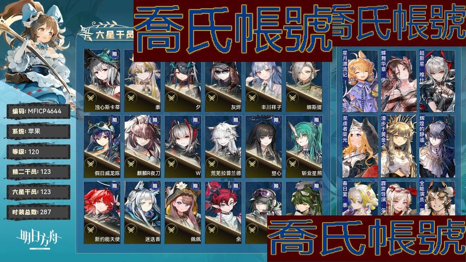 【OBMFICP464442】120級,123六星,123精二,0精一,合成玉數量:2245,源石數量:13,聯動幹員數量:20,時裝數量:287,精二六星:菲亞梅塔,白鐵,忍冬,林,魔王,夜鶯,推進之王,濁心斯卡蒂,黍,滌火傑西卡,邏各斯,真言,弒君者,夕,灰燼,豐川祥子,遠牙,娜斯提,星熊,琴柳,傀影,水月,黑,澄閃,歌蕾蒂婭,伺夜,安潔莉娜,信仰攪拌機,塞雷婭,假日威龍陳,霍爾海雅,森蚺,電弧,麒麟R夜刀,W,伊內絲,荒蕪拉普蘭德,嵯峨,刻俄柏,塑心,阿,鐧,萊伊,卡涅利安,空弦,黑鍵,蕾繆安,淬羽赫默,赫拉格,Mon3tr,凱爾希,麥哲倫,斬業星熊,瑪恩納,新約能天使,阿斯卡綸,迷迭香,閃靈,琳琅詩懷雅,泥岩,鴻雪,溫蒂,棘刺,佩佩,餘,艾拉,早露,異客,燭煌,百鍊嘉維爾,娜仁圖亞,死芒,號角,艾麗妮,維什戴爾,能天使,老鯉,赫德雷,瑪露西爾,艾雅法拉,妮芙,煌,溯光星源,提豐,緘默德克薩斯,瑕光,年,仇白,陳,伊芙利特,左樂,聖約送葬人,焰影葦草,薇薇安娜,莫斯提馬,焰尾,重嶽,遙,隱德來希,流明,止頌,聖聆初雪,山,斯卡蒂,烏爾比安,純燼艾雅法拉,繆爾賽思,多蘿西,歸溟幽靈鯊,斥罪,風笛,引星棘刺,凜御銀灰,酒神,銀灰,史爾特爾,耀騎士臨光,帕拉斯,維娜·維多利亞,鈴蘭,司霆驚蟄,靈知,令;聯動幹員:灰燼,豐川祥子,艾拉,瑪露西爾,若葉睦,醫生,導火索,閃擊,戰車,九色鹿,雙月,霜華,泰拉大陸調查團,萊歐斯,八幡海鈴,森西,祐天寺若麥,齊爾查克,三角初華,羅小黑;時裝:星月漂流記·克洛絲,蝶舞華章·伊內絲,超新星·維什戴爾,至虔者榮光·空弦,漫步於黃金之夢·繆爾賽思,輝煌的靜謐·邏各斯,春日宴·黍,霹靂導演·年,全能演員·重嶽,暗月的影子·鐧,無我唯識·塑心,眾志歸一·聖約送葬人,幽蘭秘辛·緘默德克薩斯,遠行前的野餐·純燼艾雅法拉,流輝·夜鶯,不融冰·銀灰,新枝·繆爾賽思,燃燒天穹下·伊內絲,紅女爵·濁心斯卡蒂,破翼者·緘默德克薩斯,何處棲·重嶽,博物·焰影葦草,遠路·瑪恩納,列瑤臺·林,崖高夢遠·令,悠然假日HD26·百鍊嘉維爾,夏卉FA394·澄閃,殘餘·凱爾希,生而為一·歸溟幽靈鯊,萬重山·假日威龍陳,濯纓·令,夏日餮宴·水月,字句中的雪原·鴻雪,手到牌來·老鯉,今昔須臾之夢·異客,復現榮光·耀騎士臨光,擁抱新生·迷迭香,焦點·傀影,繽紛奇境CW03·史爾特爾,昇華·濁心斯卡蒂,染塵煙·夕,樂逍遙·年,恍惚·W,悠然假日HD71·寒檀,旋律的主人·豐川祥子,一人車隊·賈維,綿絨小魔女·艾雅法拉,恆久祭禮·霍爾海雅,蒸汽尋蹤者·聖約送葬人,雨霓行遊客·流明,火種·火神,悠然假日HD29·安比爾,糖果暴擊·奧達,玩伴·紅雲,空心王冠·白鐵,夏卉FA361·空,家傳秘方·暴行,甜美配方·妮芙,審判日·菲亞梅塔,幻語樂痕·莫斯提馬,蒼茫怒號·瑪恩納,最初的頌歌·PhonoR-0,拭刀·刻刀,封面傭兵·石英,寄自奧格尼斯科·薇薇安娜,幻火·止頌,風笛聲聲·風笛,夢幻高空·萊伊,斜照·折光,礫瓦·泥岩,玫瑰騎手·維荻,相位面容·錫人,易爆藍焰·煌,至高判決·艾麗妮,棲息·淬羽赫默,隨意而行·蘇蘇洛,雙料四分衛·THRM-EX,坊間涼茶鋪·老鯉,地底三百米·暴行,花房茶話會·澄閃,從容時刻·翎羽,沉思之庭·赫德雷,我即潮汐·歌蕾蒂婭,悠然假日HD61·蜜蠟,歷世流風·霍爾海雅,記敘·斥罪,傾聽·溫蒂,律動方格·琳琅詩懷雅,鋒潮·棘刺,禮遇·仇白,賀新禧·清流,密室·艾拉,單刀·炎客,偶爾醉陶·斥罪,晚間咖啡店·安賽爾,星櫞林·流星,皇家近衛·風笛,主修領域·地靈,敘拉古的彼面·伺夜,命運主宰·多蘿西,霜林醉·仇白,北地引路人·提豐,晴日·卡緹,至聖誓言·菲亞梅塔,悠然假日HD49·錫蘭,夏卉FA317·琴柳,觸及星辰·阿米婭,沙灘護衛GT003·白鐵,夏卉FA062·桃金娘,悠然假日HDm57·褐果,下一頓午茶·斯卡蒂,競技之夢改裝·正義騎士號,彼有·嵯峨,奇工妙想·星極,飛羽·艾麗妮,山川的釀造·帕拉斯,捉風·遠牙,化花·號角,衣縷往昔·梓蘭,書信零落·海蒂,枝頭馥·夜半,雪霽·鈴蘭,變奏·黑鍵,燦海浮夢·流明,躍上街頭·泰拉大陸調查團,燈如晝·曉歌,火樹靈·布丁,面紗之下·獅蠍,風雪邀請·史都華德,遙鄉之徑·夏櫟,喜夜侍者·澄閃,繪聲繪影·深海色,春之頌·鈴蘭,組間休息·布洛卡,偽裝·宴,夏卉FA374·羅比菈塔,無痕行者·安德切爾,讀者·山,燦陽朝露SD08·卡涅利安,返航·歌蕾蒂婭,夏卉FA641·夜半,小健將·焰尾,擁抱新生·迷迭香曾經,荒野之後·蜜莓,幽苔·暴雨,夏卉FA210·羽毛筆,超級斷罪朋友·斷罪者,燦陽朝露SDm11·極境,識芳·琴柳,先驅·靈知,摧城·推進之王,悍將·因陀羅,幽谷奏鳴·石棉,植藥·桑葚,破冰·霜葉,海岸救援改裝·Lancet-2,黑曜石·泥岩,無拘無束·刻俄柏,未完成的禮物·豆苗,妙手玄心·阿,縱身一躍·傑克,霍恩洛厄的寒沙·卡涅利安,且試箸·食鐵獸,傳承·帕拉斯,待晴日·深靛,傑作·早露,悠然假日HD31·華法琳,宣傳策略·空弦,殿堂上的遊禽·星極,傾聲歌唱·松果,淺灘律動·藍毒,異月災裔·瑕光,夏卉FA026·蘇蘇洛,爆裂菲林·煌,夏卉FA018·艾雅法拉,淡金慶典·桃金娘,輕風LB01·紅,安息處的怪盜·卡達,夏卉FA017·安潔莉娜,愜意·棘刺,靜謐午夜DN04·特米米,歧路幻影·赫拉格,曲刃晴風·白雪,自由失效·史爾特爾,靜謐午夜DN06·泥岩,烏雲·山,沙灘護衛GT002·孑,熔鍛鑄匠·森蚺,遊俠·灰燼,模特之夜·礫,領主·戰車,天際線·黑,霜息·赫默,古堡清潔專家·阿消,棄土花開·鈴蘭,百面郎中·阿,超載·雷蛇,孤寒峭·絮雨,小憩初醒·波登可,探尋者SKm01·銀灰,夏卉FA333·刻俄柏,鐵律·塞雷婭,夢魘之夢·傀影,糖