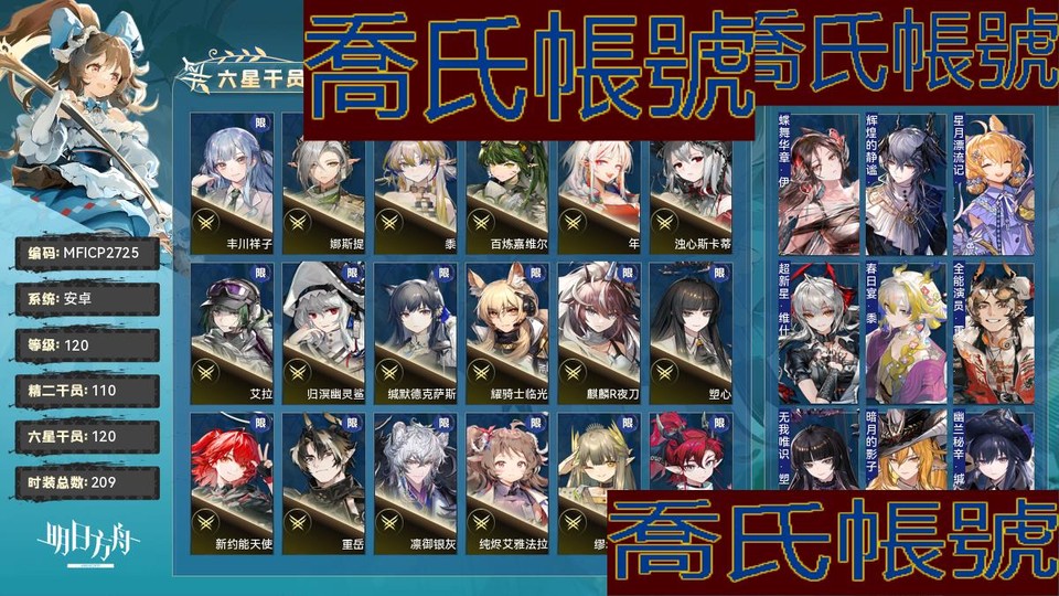 【OBMFICP272542】120級,120六星,110精二,1精一,合成玉數量:55054,源石數量:241,聯動幹員數量:20,時裝數量:209,精二六星:酒神,豐川祥子,霍爾海雅,赫德雷,娜斯提,黍,麥哲倫,薇薇安娜,瑕光,卡涅利安,靈知,維娜·維多利亞,空弦,鈴蘭,星熊,森蚺,真言,焰尾,魔王,鐧,早露,遠牙,百鍊嘉維爾,夜鶯,年,瑪恩納,濁心斯卡蒂,黑鍵,斥罪,艾拉,滌火傑西卡,歸溟幽靈鯊,泥岩,莫斯提馬,左樂,白鐵,阿斯卡綸,史爾特爾,水月,斯卡蒂,緘默德克薩斯,聖約送葬人,耀騎士臨光,能天使,麒麟R夜刀,風笛,塑心,烏爾比安,新約能天使,塞雷婭,重嶽,琴柳,號角,仇白,凜御銀灰,推進之王,流明,艾麗妮,安潔莉娜,純燼艾雅法拉,赫拉格,傀影,歌蕾蒂婭,棘刺,遙,繆爾賽思,閃靈,餘,伊內絲,伊芙利特,斬業星熊,老鯉,銀灰,多蘿西,夕,佩佩,帕拉斯,妮芙,阿,嵯峨,異客,林,維什戴爾,假日威龍陳,鴻雪,聖聆初雪,娜仁圖亞,焰影葦草,陳,邏各斯,迷迭香,刻俄柏,黑,溫蒂,死芒,灰燼,電弧,瑪露西爾,凱爾希,艾雅法拉,澄閃,提豐,令,荒蕪拉普蘭德,蕾繆安,Mon3tr,萊伊,山,菲亞梅塔,煌;精一六星:琳琅詩懷雅;六星幹員:酒神,豐川祥子,霍爾海雅,赫德雷,娜斯提,黍,麥哲倫,薇薇安娜,瑕光,卡涅利安,靈知,維娜·維多利亞,空弦,鈴蘭,星熊,森蚺,真言,焰尾,魔王,鐧,早露,遠牙,百鍊嘉維爾,夜鶯,年,瑪恩納,濁心斯卡蒂,黑鍵,斥罪,艾拉,滌火傑西卡,歸溟幽靈鯊,泥岩,莫斯提馬,左樂,白鐵,阿斯卡綸,史爾特爾,水月,斯卡蒂,緘默德克薩斯,聖約送葬人,耀騎士臨光,能天使,麒麟R夜刀,風笛,塑心,烏爾比安,新約能天使,塞雷婭,重嶽,琴柳,號角,仇白,凜御銀灰,推進之王,流明,艾麗妮,安潔莉娜,純燼艾雅法拉,赫拉格,傀影,歌蕾蒂婭,棘刺,遙,繆爾賽思,閃靈,餘,伊內絲,伊芙利特,斬業星熊,老鯉,銀灰,多蘿西,夕,佩佩,帕拉斯,妮芙,阿,嵯峨,異客,林,維什戴爾,假日威龍陳,鴻雪,聖聆初雪,娜仁圖亞,焰影葦草,陳,邏各斯,迷迭香,刻俄柏,黑,溫蒂,死芒,灰燼,電弧,瑪露西爾,凱爾希,艾雅法拉,澄閃,提豐,令,荒蕪拉普蘭德,蕾繆安,Mon3tr,萊伊,山,菲亞梅塔,煌,琳琅詩懷雅,弒君者,燭煌,忍冬,溯光星源,信仰攪拌機,淬羽赫默,W,止頌,伺夜;聯動幹員:豐川祥子,艾拉,九色鹿,灰燼,瑪露西爾,戰車,森西,閃擊,導火索,醫生,萊歐斯,祐天寺若麥,齊爾查克,三角初華,泰拉大陸調查團,雙月,霜華,羅小黑,若葉睦,八幡海鈴;時裝:蝶舞華章·伊內絲,輝煌的靜謐·邏各斯,星月漂流記·克洛絲,超新星·維什戴爾,春日宴·黍,全能演員·重嶽,無我唯識·塑心,暗月的影子·鐧,幽蘭秘辛·緘默德克薩斯,遠行前的野餐·純燼艾雅法拉,流輝·夜鶯,新枝·繆爾賽思,燃燒天穹下·伊內絲,紅女爵·濁心斯卡蒂,何處棲·重嶽,破翼者·緘默德克薩斯,列瑤臺·林,博物·焰影葦草,遠路·瑪恩納,崖高夢遠·令,悠然假日HD26·百鍊嘉維爾,夏卉FA394·澄閃,殘餘·凱爾希,生而為一·歸溟幽靈鯊,萬重山·假日威龍陳,夏日餮宴·水月,濯纓·令,字句中的雪原·鴻雪,復現榮光·耀騎士臨光,繽紛奇境CW03·史爾特爾,焦點·傀影,昇華·濁心斯卡蒂,染塵煙·夕,樂逍遙·年,綿絨小魔女·艾雅法拉,悠然假日HD71·寒檀,旋律的主人·豐川祥子,火種·火神,玩伴·紅雲,糖果暴擊·奧達,空心王冠·白鐵,家傳秘方·暴行,甜美配方·妮芙,拭刀·刻刀,蒼茫怒號·瑪恩納,最初的頌歌·PhonoR-0,寄自奧格尼斯科·薇薇安娜,封面傭兵·石英,礫瓦·泥岩,夢幻高空·萊伊,玫瑰騎手·維荻,斜照·折光,相位面容·錫人,易爆藍焰·煌,至高判決·艾麗妮,泰拉冒險·瑪露西爾,雙料四分衛·THRM-EX,花房茶話會·澄閃,隨意而行·蘇蘇洛,地底三百米·暴行,悠然假日HD61·蜜蠟,雲上直播間·U-Official,從容時刻·翎羽,歷世流風·霍爾海雅,密室·艾拉,禮遇·仇白,賀新禧·清流,律動方格·琳琅詩懷雅,晚間咖啡店·安賽爾,單刀·炎客,偶爾醉陶·斥罪,星櫞林·流星,晴日·卡緹,主修領域·地靈,悠然假日HD49·錫蘭,北地引路人·提豐,命運主宰·多蘿西,觸及星辰·阿米婭,至聖誓言·菲亞梅塔,霜林醉·仇白,夏卉FA062·桃金娘,夏卉FA317·琴柳,悠然假日HDm57·褐果,下一頓午茶·斯卡蒂,悠然假日HD29·安比爾,化花·號角,奇工妙想·星極,飛羽·艾麗妮,彼有·嵯峨,衣縷往昔·梓蘭,雪霽·鈴蘭,山川的釀造·帕拉斯,枝頭馥·夜半,火樹靈·布丁,靈巧侍者·耶拉,燈如晝·曉歌,繪聲繪影·深海色,照冰輪·桑葚,遙鄉之徑·夏櫟,喜夜侍者·澄閃,風雪邀請·史都華德,幻影輕悄·風丸,組間休息·布洛卡,春之頌·鈴蘭,偽裝·宴,夏卉FA374·羅比菈塔,心性·赤冬,無痕行者·安德切爾,返航·歌蕾蒂婭,小健將·焰尾,夏卉FA210·羽毛筆,燦陽朝露SDm11·極境,摧城·推進之王,破冰·霜葉,超級斷罪朋友·斷罪者,幽谷奏鳴·石棉,識芳·琴柳,無拘無束·刻俄柏,海岸救援改裝·Lancet-2,未完成的禮物·豆苗,黑曜石·泥岩,縱身一躍·傑克,霍恩洛厄的寒沙·卡涅利安,待晴日·深靛,悠然假日HD31·華法琳,妙手玄心·阿,傑作·早露,異月災裔·瑕光,魔城迴響·巫戀,宣傳策略·空弦,殿堂上的遊禽·星極,安息處的怪盜·卡達,夏卉FA018·艾雅法拉,淺灘律動·藍毒,夏卉FA026·蘇蘇洛,夏卉FA017·安潔莉娜,輕風LB01·紅,靜謐午夜DN06·泥岩,愜意·棘刺,自由失效·史爾特爾,爆裂菲林·煌,烏雲·山,殘葛·亞葉,熔鍛鑄匠·森蚺,小憩初醒·波登可,歧路幻影·赫拉格,荒原行者·普羅旺斯,遊俠·灰燼,專業人士·斑點,天際線·黑,孤寒峭·絮雨,古堡清潔專家·阿消,棄土花開·鈴蘭,霜息·赫默,意志·德克薩斯,