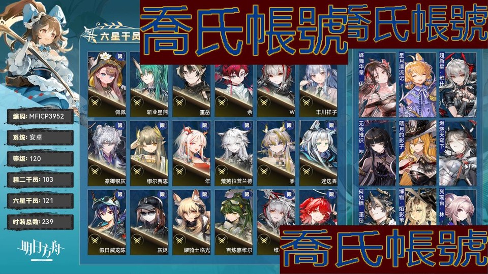 【OBMFICP395242】120級,121六星,103精二,1精一,合成玉數量:57905,源石數量:1063,聯動幹員數量:18,時裝數量:239,精二六星:仇白,艾雅法拉,霍爾海雅,瑪恩納,斯卡蒂,陳,佩佩,卡涅利安,塞雷婭,斬業星熊,遠牙,伺夜,重嶽,餘,妮芙,鴻雪,W,推進之王,豐川祥子,史爾特爾,凜御銀灰,繆爾賽思,娜仁圖亞,年,真言,邏各斯,烏爾比安,鐧,早露,泥岩,銀灰,空弦,司霆驚蟄,荒蕪拉普蘭德,星熊,煌,伊內絲,黍,黑,棘刺,林,迷迭香,假日威龍陳,山,能天使,號角,黑鍵,赫拉格,瑕光,澄閃,灰燼,耀騎士臨光,百鍊嘉維爾,森蚺,死芒,琴柳,焰尾,菲亞梅塔,艾麗妮,刻俄柏,嵯峨,風笛,維什戴爾,新約能天使,赫德雷,莫斯提馬,帕拉斯,電弧,流明,維娜·維多利亞,鈴蘭,歸溟幽靈鯊,麒麟R夜刀,聖聆初雪,夕,萊伊,溫蒂,塑心,凱爾希,阿,蕾繆安,傀影,老鯉,閃靈,阿斯卡綸,Mon3tr,麥哲倫,歌蕾蒂婭,酒神,水月,夜鶯,遙,令,純燼艾雅法拉,濁心斯卡蒂,靈知,緘默德克薩斯,伊芙利特,焰影葦草,娜斯提,安潔莉娜,艾拉,魔王;精一六星:左樂;六星幹員:仇白,艾雅法拉,霍爾海雅,瑪恩納,斯卡蒂,陳,佩佩,卡涅利安,塞雷婭,斬業星熊,遠牙,伺夜,重嶽,餘,妮芙,鴻雪,W,推進之王,豐川祥子,史爾特爾,凜御銀灰,繆爾賽思,娜仁圖亞,年,真言,邏各斯,烏爾比安,鐧,早露,泥岩,銀灰,空弦,司霆驚蟄,荒蕪拉普蘭德,星熊,煌,伊內絲,黍,黑,棘刺,林,迷迭香,假日威龍陳,山,能天使,號角,黑鍵,赫拉格,瑕光,澄閃,灰燼,耀騎士臨光,百鍊嘉維爾,森蚺,死芒,琴柳,焰尾,菲亞梅塔,艾麗妮,刻俄柏,嵯峨,風笛,維什戴爾,新約能天使,赫德雷,莫斯提馬,帕拉斯,電弧,流明,維娜·維多利亞,鈴蘭,歸溟幽靈鯊,麒麟R夜刀,聖聆初雪,夕,萊伊,溫蒂,塑心,凱爾希,阿,蕾繆安,傀影,老鯉,閃靈,阿斯卡綸,Mon3tr,麥哲倫,歌蕾蒂婭,酒神,水月,夜鶯,遙,令,純燼艾雅法拉,濁心斯卡蒂,靈知,緘默德克薩斯,伊芙利特,焰影葦草,娜斯提,安潔莉娜,艾拉,魔王,左樂,淬羽赫默,瑪露西爾,異客,忍冬,弒君者,滌火傑西卡,止頌,信仰攪拌機,溯光星源,隱德來希,提豐,斥罪,琳琅詩懷雅,燭煌,引星棘刺,多蘿西,白鐵;聯動幹員:瑪露西爾,豐川祥子,灰燼,艾拉,閃擊,祐天寺若麥,森西,導火索,醫生,雙月,戰車,九色鹿,八幡海鈴,泰拉大陸調查團,三角初華,若葉睦,霜華,羅小黑;時裝:蝶舞華章·伊內絲,星月漂流記·克洛絲,超新星·維什戴爾,無我唯識·塑心,暗月的影子·鐧,燃燒天穹下·伊內絲,何處棲·重嶽,博物·焰影葦草,列瑤臺·林,破翼者·緘默德克薩斯,遠路·瑪恩納,崖高夢遠·令,悠然假日HD26·百鍊嘉維爾,夏卉FA394·澄閃,殘餘·凱爾希,生而為一·歸溟幽靈鯊,萬重山·假日威龍陳,濯纓·令,夏日餮宴·水月,字句中的雪原·鴻雪,復現榮光·耀騎士臨光,繽紛奇境CW03·史爾特爾,焦點·傀影,昇華·濁心斯卡蒂,染塵煙·夕,樂逍遙·年,恍惚·W,一人車隊·賈維,夏卉FA361·空,糖果暴擊·奧達,家傳秘方·暴行,最初的頌歌·PhonoR-0,甜美配方·妮芙,拭刀·刻刀,繁霜滿階·纏丸,玫瑰騎手·維荻,斜照·折光,礫瓦·泥岩,相位面容·錫人,隨意而行·蘇蘇洛,雙料四分衛·THRM-EX,地底三百米·暴行,我即潮汐·歌蕾蒂婭,悠然假日HD61·蜜蠟,從容時刻·翎羽,花房茶話會·澄閃,雲上直播間·U-Official,歷世流風·霍爾海雅,密室·艾拉,賀新禧·清流,悠然假日HD71·寒檀,單刀·炎客,主修領域·地靈,晚間咖啡店·安賽爾,古往今來的月·九色鹿,星櫞林·流星,北地引路人·提豐,晴日·卡緹,觸及星辰·阿米婭,悠然假日HD49·錫蘭,霜林醉·仇白,棠雲巧夢·子月,夏卉FA317·琴柳,夏卉FA062·桃金娘,幽邃隱修·絮雨,悠然假日HDm57·褐果,悠然假日HD29·安比爾,競技之夢改裝·正義騎士號,化花·號角,奇工妙想·星極,衣縷往昔·梓蘭,山川的釀造·帕拉斯,廊下游·寒芒克洛絲,枝頭馥·夜半,雪霽·鈴蘭,月宵·薄綠,靈巧侍者·耶拉,火樹靈·布丁,別枝·稀音,燈如晝·曉歌,躍上街頭·泰拉大陸調查團,面紗之下·獅蠍,照冰輪·桑葚,繪聲繪影·深海色,遙鄉之徑·夏櫟,風雪邀請·史都華德,正義締造者·野鬃,喜夜侍者·澄閃,未講述的故事·埃拉託,夏卉FA374·羅比菈塔,春之頌·鈴蘭,幻影輕悄·風丸,組間休息·布洛卡,歡唱之前·洛洛,偽裝·宴,無痕行者·安德切爾,讀者·山,心性·赤冬,燦陽朝露SD08·卡涅利安,荒野之後·蜜莓,夏卉FA641·夜半,夏卉FA210·羽毛筆,如歌·空,小健將·焰尾,幽苔·暴雨,超級斷罪朋友·斷罪者,幽谷奏鳴·石棉,識芳·琴柳,翡翠假日·葦草,植藥·桑葚,破冰·霜葉,未完成的禮物·豆苗,無拘無束·刻俄柏,街道狂花·槐琥,暮影藤蘿·炎獄炎熔,縱身一躍·傑克,霍恩洛厄的寒沙·卡涅利安,極晝捕手·極光,妙手玄心·阿,海岸救援改裝·Lancet-2,黑曜石·泥岩,且試箸·食鐵獸,待晴日·深靛,異月災裔·瑕光,傳承·帕拉斯,悠然假日HD31·華法琳,魔城迴響·巫戀,傑作·早露,詩人的假日·流星,榮耀之紫·鞭刃,宣傳策略·空弦,殿堂上的遊禽·星極,安息處的怪盜·卡達,淡金慶典·桃金娘,傾聲歌唱·松果,夏卉FA018·艾雅法拉,淺灘律動·藍毒,夏卉FA026·蘇蘇洛,愜意·棘刺,夏卉FA017·安潔莉娜,靜謐午夜DN04·特米米,自由失效·史爾特爾,輕風LB01·紅,靜謐午夜DN06·泥岩,殘葛·亞葉,輕風LB03·鑄鐵,爆裂菲林·煌,歧路幻影·赫拉格,烏雲·山,曲刃晴風·白雪,熔鍛鑄匠·森蚺,白沙·蜜蠟,倫式巫女·月禾,閒適午後·調香師,小憩初醒·波登可,專業人士·斑點,遊俠·灰燼,荒原行者·普羅旺斯,天際線·黑,廣場掃蕩客·格勞克斯,超載·雷蛇,孤寒峭·絮雨,