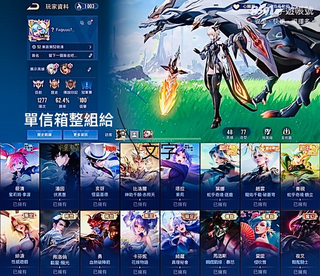 【Garena帳有綁定、璀璨傳說、V5、48英、77造】蜜莉姆、伏黑、基德、新年葉娜比洛爾趙雲 歷史璀璨高勝