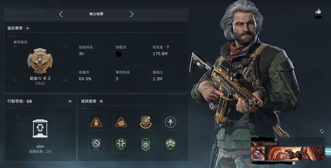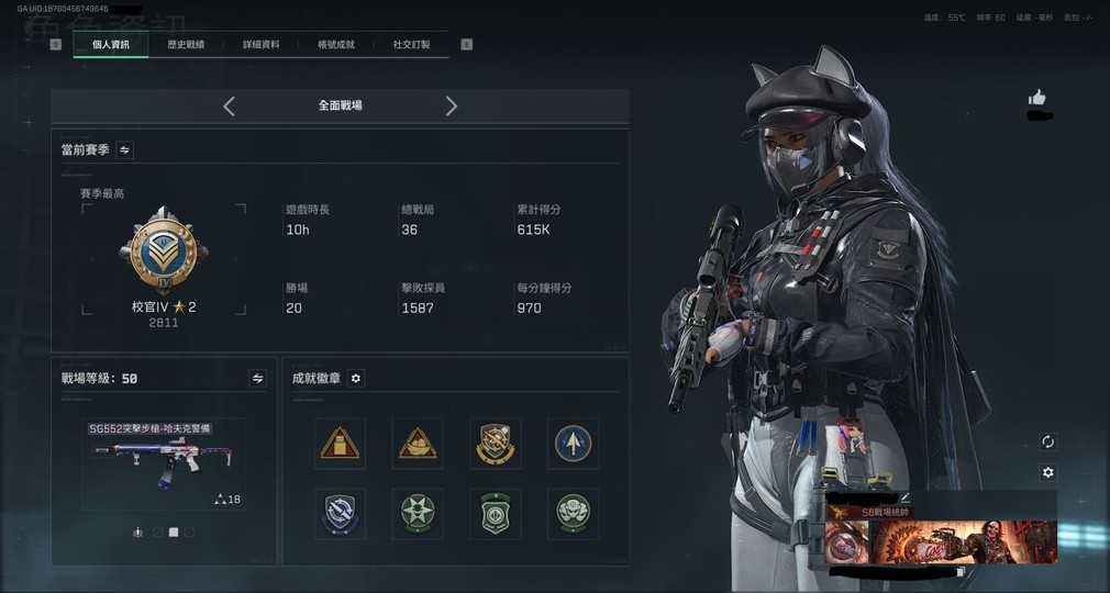 帳號敘述如圖所示,攻防跟烽火皆滿級。