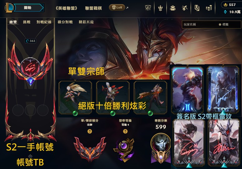 【單雙宗師】S2一手帳號/絕版十倍勝利/EDG亞菲簽名版/金色IG凱莎/大師菁英