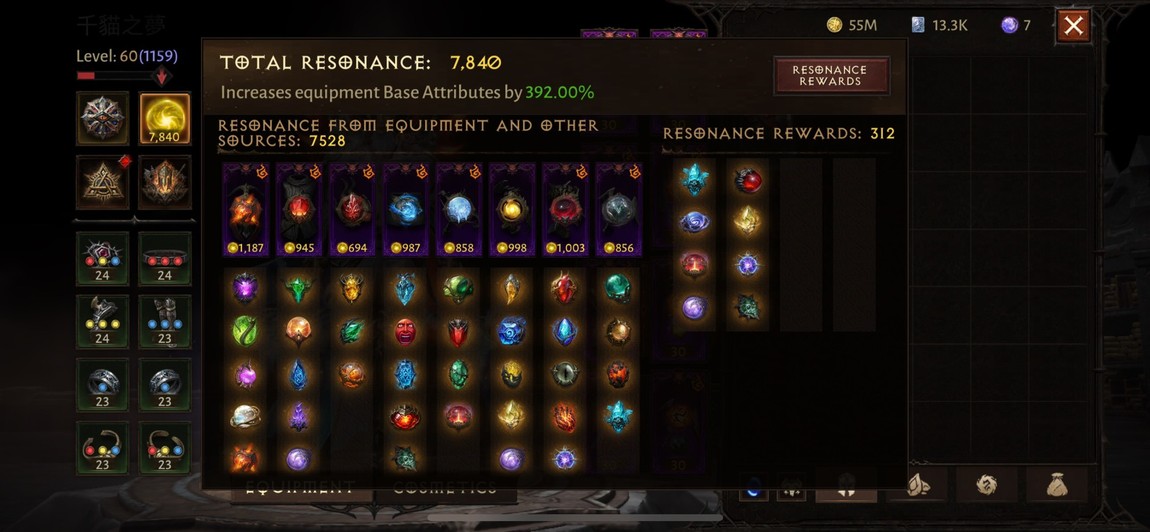 【1159等】共鳴7840,全身5/5,10級翻騰,小寶石多8級,救星貓,七套傳奇時裝