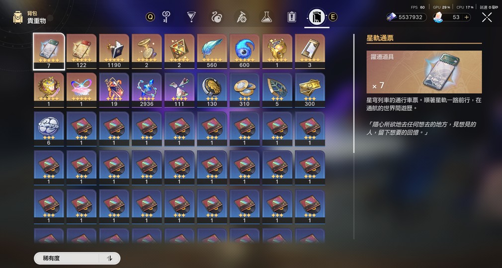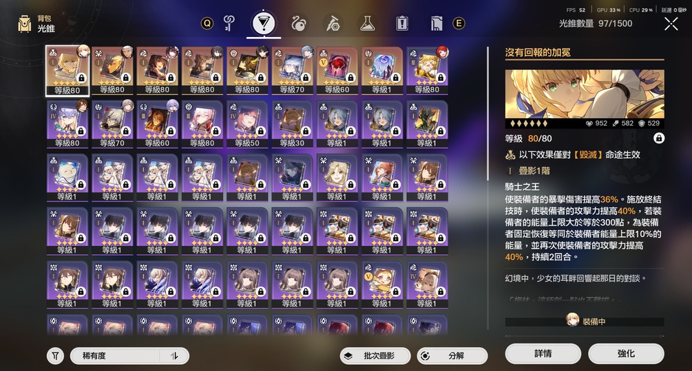 主線約破到3.1左右 支線只破部分 以往活動劇情幾乎未動 匹諾康尼和翁法羅斯地圖寶箱幾乎未動 金靈還有1顆 雙倍還在 角色池抽54抽 大保