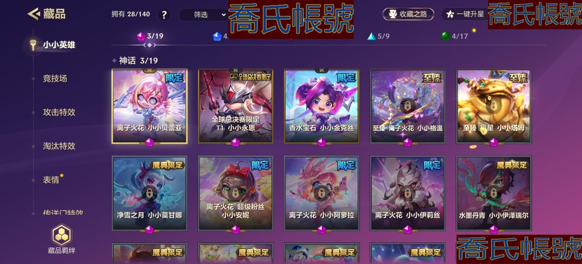【OBJNIVD719242】等級:Lv31, 段位:白銀III, 卓越級小小英雄數量:0, 至臻級小小英雄數量:0, 神話級小小英雄數量:3, 英雄級小小英雄數量:2, 小小英雄數量:28, 棋盤數量:3, 特效數量:11, 神話級小小英雄:全球總決賽限定T1小小永恩,香水寶石小小金克絲, 英雄級小小英雄:小小銳雯,小小泰隆;其它競技場:凌雲, 金克絲的臥室, 弗雷爾卓德號飛空艇;三星小小英雄:小鯊魚, 巴適得板胖胖龍;攻擊特效:攻擊特效預設攻擊特效,攻擊特效小小凱特琳,攻擊特效小小泰隆,攻擊特效小小銳雯,攻擊特效給你一鏟鏟,攻擊特效香水寶石小小金克絲,攻擊特效小小墨菲特,攻擊特效全球總決賽限定nT1小小永恩,攻擊特效寶石高能光束2星,攻擊特效星落大地1星3神話