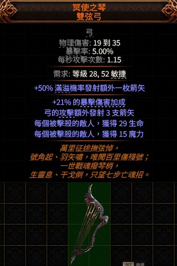 【弓、冥使之琴】冥使之琴 +3額外箭矢|鰥寡之托+箭袋加成|迷霧低語者+2連鎖|【初始拓荒】