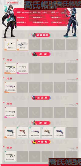 【OBWVGBW075042】Lv90|神話I, 刀皮數量2,槍皮數量10(絕版0限定5終極0卓越2);皮膚資產價值13810,已用R點390;【刀皮】:近戰武器-紫金爪刀,近戰武器-黑波之刃; 【槍皮】:正義-塑水宗,狂徒-RGX11zPro,戍衛-多彌爾的復仇,狂徒-紫闕金琅,冥駒-離子武器,標配-星際獵兵,駭靈-無限競技,正義-日耀風暴,鬼魅-幻心獵手,標配-阿特拉斯指揮部;【熱門卡面】:勢不可擋蝰蛇卡面,勢不可擋捷風卡面,雙城之戰金克絲卡面;【熱門噴漆】:雙擊點贊噴漆,買裝還是存錢噴漆,紙箱小貓噴漆,沒有資金噴漆;【皮膚可能含有某些特權皮膚,具體以遊戲內實際擁有為準】