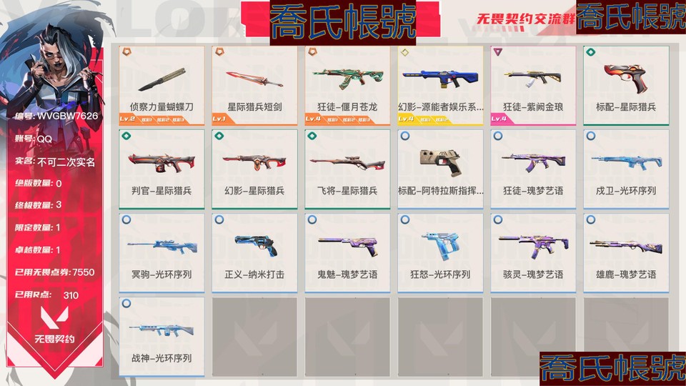 【OBWVGBW762642】Lv91|白銀III, 刀皮數量2,槍皮數量17(絕版0限定3終極1卓越1);皮膚資產價值7550,已用R點310;【刀皮】:近戰武器-偵察力量蝴蝶刀,近戰武器-星際獵兵短劍; 【槍皮】:狂徒-偃月蒼龍,幻影-源能者娛樂系統,狂徒-紫闕金琅,標配-星際獵兵,判官-星際獵兵,幻影-星際獵兵,飛將-星際獵兵,標配-阿特拉斯指揮部,狂徒-瑰夢藝語,戍衛-光環序列,冥駒-光環序列,正義-奈米打擊,鬼魅-瑰夢藝語,狂怒-光環序列,駭靈-瑰夢藝語,雄鹿-瑰夢藝語,戰神-光環序列;【熱門卡面】:雙城之戰擁抱卡面,雙城之戰金克絲卡面;【熱門掛飾】:神中神掛飾,雙城之戰小蛋糕掛飾;【熱門噴漆】:買裝還是存錢噴漆,放下武器噴漆;【皮膚可能含有某些特權皮膚,具體以遊戲內實際擁有為準】偵察蝴蝶**號