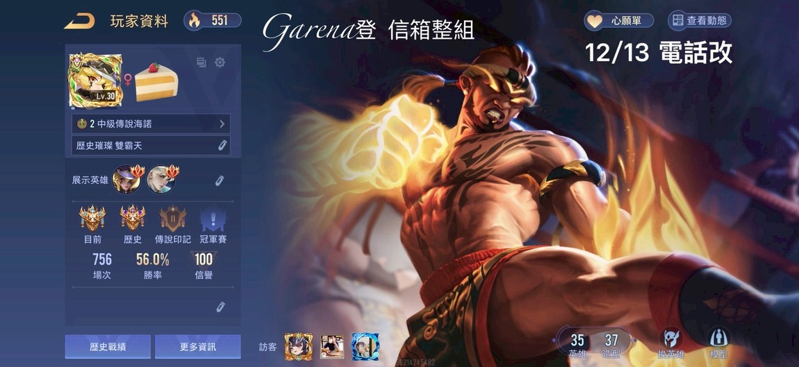 【Garena帳有綁定、先鋒傳說·天際、V4、35英、37造】歷史璀璨,雙紅標。森圖•超級玩家、拉茲•一拳超神