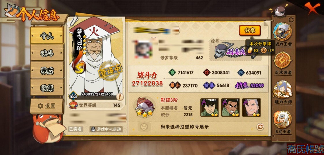 【11等】戰鬥力:2712W+;段位:影級3階;本服排名:19;戰區排名:未上榜;VIP