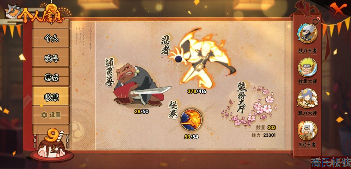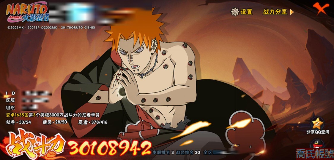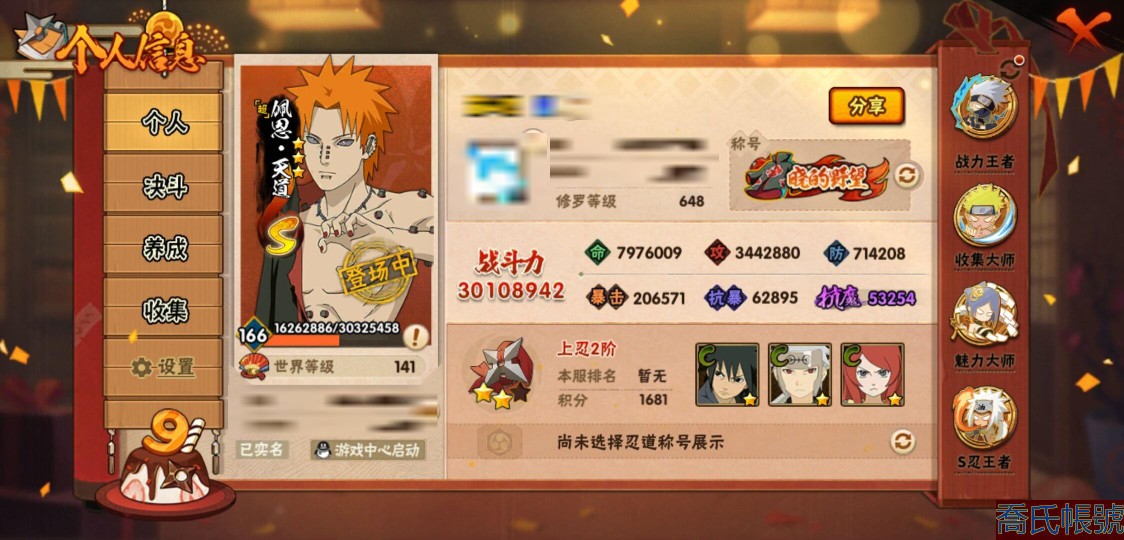 【11等】戰鬥力:3010W+;段位:上忍2階;本服排名:3;戰區排名:30;VIP15