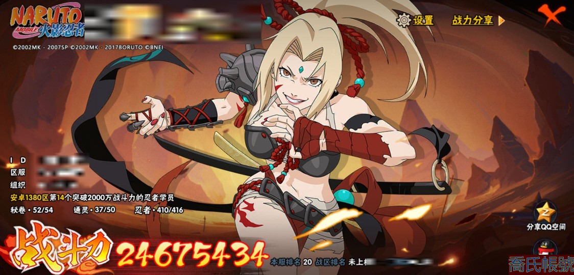 【OBHQTMS933542】戰鬥力:2467W+;段位:見習2階;本服排名:20;戰區排名:未上榜;VIP15級;S忍53個;A忍103個;通靈獸37個;S忍:綱手(5星),猿飛日斬(5星),仙人模式自來也(4星),大蛇丸(4星),波風水門(4星),穢土轉生千手柱間(4星),須佐能乎宇智波鼬(4星),天道佩恩(4星),暴怒第六尾漩渦鳴人,九喇嘛連結漩渦鳴人,永恆萬花筒宇智波佐助,忍界大戰春野櫻,須佐能乎旗木卡卡西,自來也,舞之豪傑自來也,傳說中的三忍自來也,百豪綱手,死門邁特凱,穢土轉生波風水門,九喇嘛連結波風水門,穢土轉生猿飛日斬,千手扉間,穢土轉生千手扉間,千手柱間,木葉創立千手柱間,穢土轉生宇智波斑,宇智波斑,木葉創立宇智波斑,穢土轉生解宇智波斑,穢土轉生宇智波鼬,須佐能乎宇智波止水,神秘面具男,白面具宇智波斑,忍界大戰宇智波帶土,紅夜之刃神秘面具男,四代目風影羅砂,初代目風影烈鬥,穢土轉生三代目風影,二代目水影鬼燈幻月,四代目雷影艾,忍界大戰艾,三代目雷影艾,穢土轉生金角銀角,三代目土影大野木,穢土轉生半藏,二代目土影無,忍界大戰大野木,超佩恩天道,穢土轉生長門,仙人模式藥師兜,最終章大筒木舍人,大筒木桃式,大筒木金式;A忍:邁特凱(5星),猿飛阿斯瑪(5星),疾風傳我愛羅(5星),蠍(5星),幹柿鬼鮫(5星),死司憑血飛段(5星),飛段(4星),仙人模式漩渦鳴人(3星),旗木卡卡西(3星),青年波風水門(3星),忍界大戰奇拉比(3星),地怨虞角都(3星),宇智波鼬(3星),五代目雷影達魯伊(3星),初始形態機械鳴人,忍者之路神秘面具男,九尾查克拉漩渦鳴人,萬花筒寫輪眼宇智波佐助,須佐能乎宇智波佐助,疾風傳咒印宇智波佐助,俠隱江湖宇智波佐助,宇智波泉奈,百豪春野櫻,忍界大戰秋道丁次,忍界大戰日向寧次,忍界大戰李洛克,忍界大戰天天,最終章日向雛田,幻之真容旗木卡卡西,萬花筒寫輪眼旗木卡卡西,忍界大戰旗木卡卡西,元氣夏日旗木卡卡西,驚門邁特凱,忍界大戰邁特凱,穢土轉生猿飛阿斯瑪,七夕限定猿飛阿斯瑪,地陸,宇智波止水,新春限定宇智波止水,志村團藏,火影繼承人猿飛日斬,三忍之師猿飛日斬,新春限定波風水門,新春限定我愛羅,忍界大戰我愛羅,忍界大戰勘九郎,近松十人衛千代,俠隱江湖照美冥,夏日泳裝照美冥,五代目水影照美冥,桃地再不斬,漂泊武士桃地再不斬,穢土轉生桃地再不斬,奇拉比,青年艾,達魯伊,忍界大戰土臺,三船,青年三船,俠隱江湖綱手,妖怪奇譚綱手,漂泊武士千手扉間,半蛇斗篷藥師兜,俠隱江湖藥師兜,不風,不緣,不動,青年長門,漂泊浪客佩恩六道,小南,夏日泳裝小南,漂泊浪客小南,新春限定小南,絕,黑絕,曉創生角都,角都,穢土轉生角都,新春限定大蛇丸,曉大蛇丸,緋流琥蠍,百機操演蠍,曉創生蠍,新春限定宇智波鼬,夏日限定宇智波鼬,鮫肌融合幹柿鬼鮫,迪達拉,穢土轉生迪達拉,新春限定迪達拉,阿飛,惡靈之影飛段,曉創生飛段,暴怒宇智波帶土,漂泊浪客宇智波帶土,加藤斷,忍者大戰黃土,火之意志繼承者卑留呼,羈絆神農,猿飛木葉丸,桃式顯現漩渦博人,六代目水影長十郎,四代目土影黑土,夏日限定黑土;通靈獸:忍犬,藍蛇,蛤蟆吉,忍龜,鐮鼬,猿魔,山椒魚,蜃,蛤蟆仙人,鮫鯊,蛤蟆健,烏鴉,蛞蝓,熊貓,蛤蟆龍,二尾又旅,怒鬼,,砂之守鶴,蛤蟆廣,夢貘,五尾穆王,鷹,鵺,怒鬼爪,萬蛇,蛞蝓俠隱江湖,蜘蛛,六尾犀犬,怒鬼無臂,守鶴,元氣忍犬,烏鴉夏日限定,辛牙,祥瑞金烏,變色龍;時裝:狂野鮫鯊幹柿鬼鮫,蜀面豪傑舞之豪傑自來也,百戰佩恩天道,百戰大蛇丸,桀驁之刃猿飛阿斯瑪,鋼鐵之軀邁特凱,百戰宇智波鼬須佐能乎,百戰波風水門,剎寂鬼人桃地再不斬漂泊武士,冷玉豪情綱手俠隱江湖,斑之附身神秘面具男忍者之路,詭刃寒芒藥師兜俠隱江湖,龍吟浪客千手扉間漂泊武士,太極靈韻日向花火武當宗師,仲夏微光宇智波鼬夏日限定,雷電之力艾四代目雷影,飛瀑流泉長十郎六代目水影,智勇記者宇智波佐良娜,傳說的光芒波風水門,風之守護我愛羅忍界大戰,純白之心白,紅月映雪宇智波鼬新春限定,菁英忍者旗木卡卡西少年,水之妖姬照美冥五代目水影,編織虛實宇智波鼬,可愛睡衣漩渦鳴人,龍的傳人李洛克截拳宗師,緋櫻綻放春野櫻百豪,純澈戀心日向雛田最終章,血霧怪人幹柿鬼鮫,剎那的藝術迪達拉,命定之戰宇智波佐助疾風傳,土之固守大野木三代目土影,熊貓少女天天峨眉宗師,烈土霓裳黑土四代目土影,火之意志綱手百豪,初代目火影千手柱間,憤怒的伊始宇智波帶土暴怒,驚雷掠影達魯伊五代目雷影,隱藏內心的面具旗木卡卡西暗部,睿勇新星千手扉間少年;【1781106】53s 103a