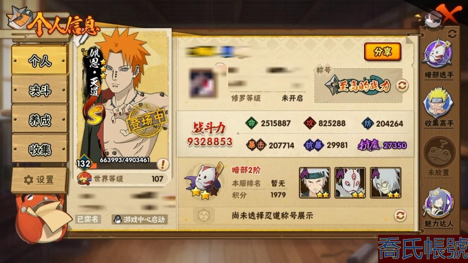 【11等】戰鬥力:932W+;段位:暗部2階;本服排名:1;戰區排名:8;VIP15級;
