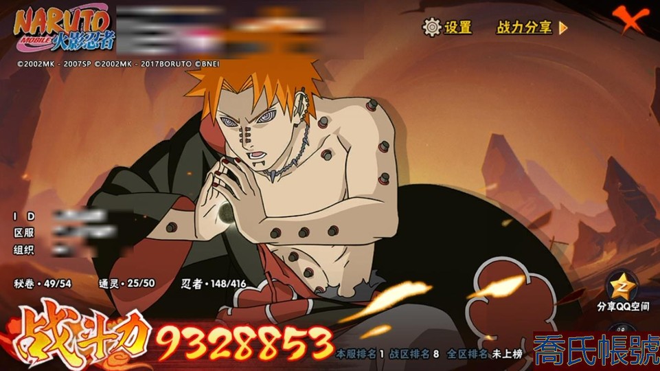 【OBHQTMS016442】戰鬥力:932W+;段位:暗部2階;本服排名:1;戰區排名:8;VIP15級;S忍8個;A忍40個;通靈獸25個;S忍:神秘面具男,五影會談宇智波斑,九喇嘛連結波風水門,暴怒第六尾漩渦鳴人,舞之豪傑自來也,須佐能乎宇智波鼬,超佩恩天道,綱手;A忍:邁特凱,猿飛阿斯瑪,忍界大戰土臺,幹柿鬼鮫,初始形態機械鳴人,忍者之路神秘面具男,須佐能乎宇智波佐助,俠隱江湖宇智波佐助,旗木卡卡西,元氣夏日旗木卡卡西,青春爆炸邁特凱,新春限定宇智波止水,新春限定波風水門,青年波風水門,新春限定我愛羅,夏日泳裝照美冥,穢土轉生桃地再不斬,漂泊武士桃地再不斬,漂泊武士千手扉間,俠隱江湖藥師兜,漂泊浪客佩恩六道,夏日泳裝小南,新春限定小南,漂泊浪客小南,黑絕,曉大蛇丸,新春限定大蛇丸,蠍,宇智波鼬,新春限定宇智波鼬,夏日限定宇智波鼬,迪達拉,新春限定迪達拉,飛段,暴怒宇智波帶土,漂泊浪客宇智波帶土,加藤斷,火之意志繼承者卑留呼,羈絆神農,夏日限定黑土;通靈獸:忍犬,藍蛇,蛤蟆吉,忍龜,蛞蝓,鐮鼬,猿魔,萬蛇,守鶴,砂之守鶴,山椒魚,熊貓,蜃,烏鴉夏日限定,祥瑞金烏,蛤蟆仙人,元氣忍犬,鮫鯊,蛤蟆健,烏鴉,,變色龍,鷹,蛤蟆龍,蛞蝓俠隱江湖;時裝:百戰宇智波鼬須佐能乎,蜀面豪傑舞之豪傑自來也,詭刃寒芒藥師兜俠隱江湖,仲夏微光宇智波鼬夏日限定,燼影絕蹤宇智波佐助俠隱江湖,太極靈韻日向花火武當宗師,滄瀾狂侍佩恩·六道漂泊浪客,剎寂鬼人桃地再不斬漂泊武士,終焉剎寂宇智波帶土漂泊浪客,晴浪礁歌黑土夏日限定,熊貓少女天天峨眉宗師,血紅辣椒旋渦玖辛奈少女,金蛇瑞財大蛇丸新春限定,可愛睡衣漩渦鳴人,烈火華服宇智波止水新春限定,神使之花小南新春限定,紅月映雪宇智波鼬新春限定,純白之心白,流沙騰龍我愛羅新春限定,憤怒的伊始宇智波帶土暴怒,驕陽翠羽照美冥夏日泳裝,萬炎焚空迪達拉新春限定,夏日衝浪旗木卡卡西元氣夏日;【912區】【蘋果QQ】本服第一戰區第八底子很好
