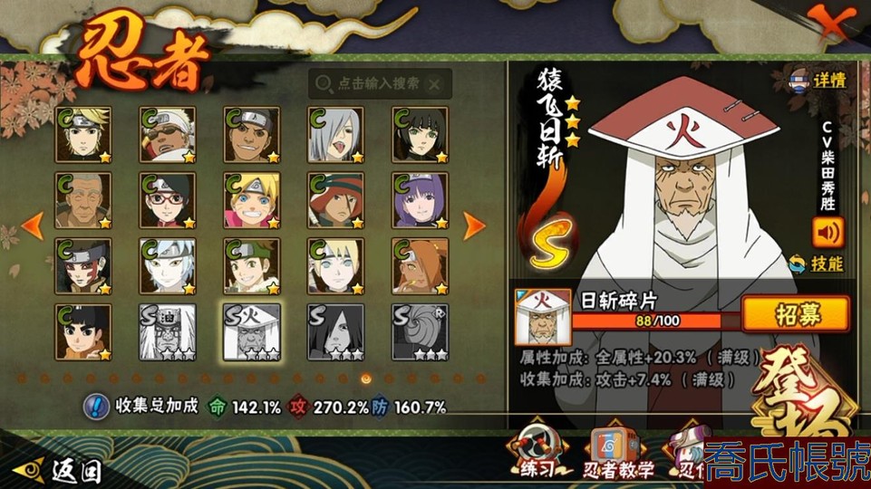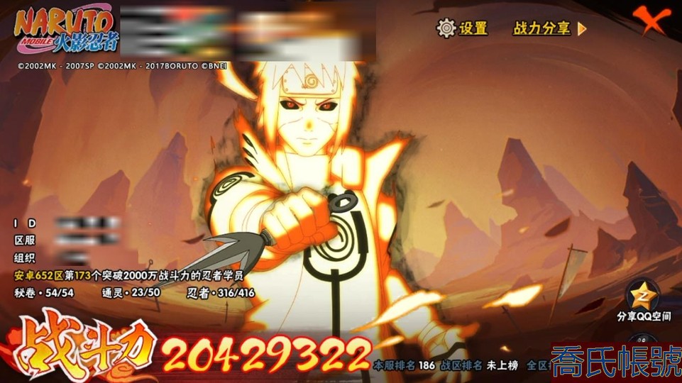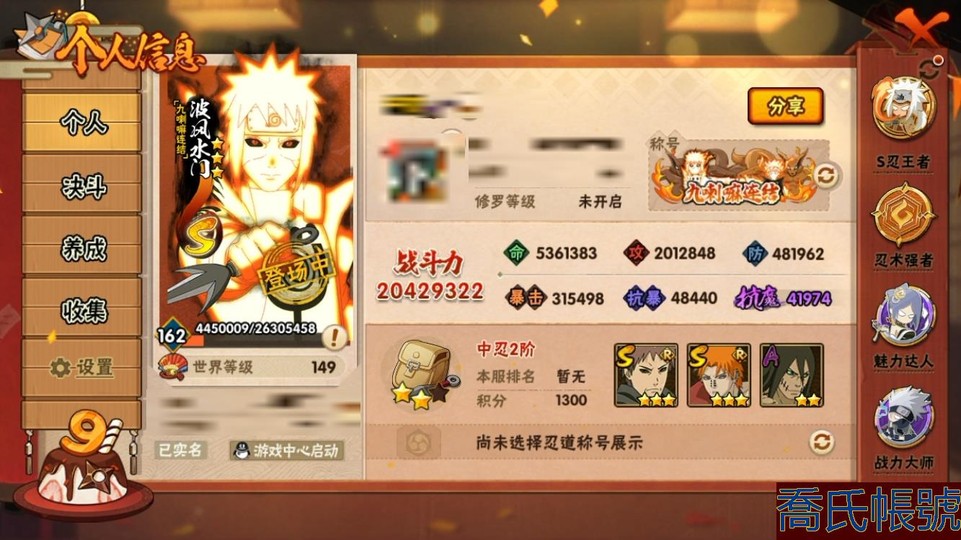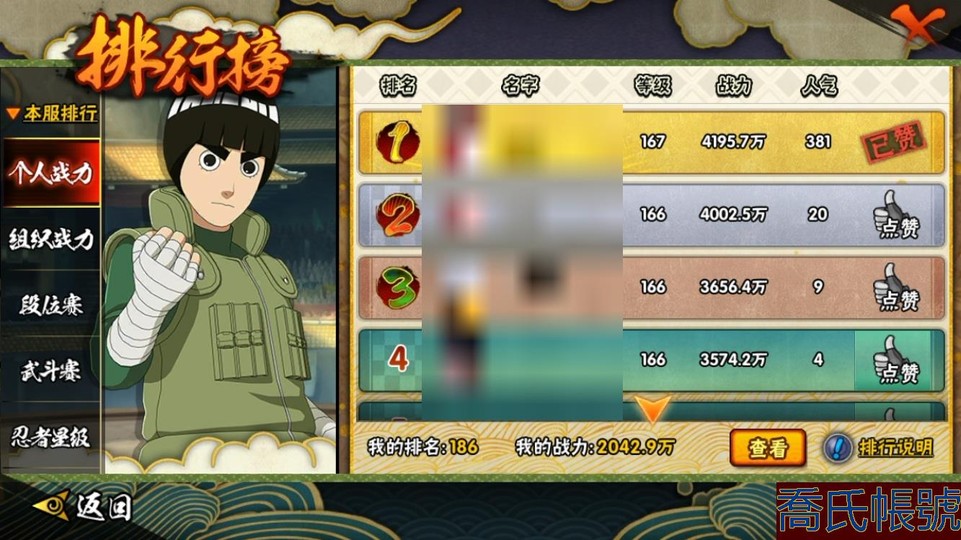 【11等】戰鬥力:2042W+;段位:中忍2階;本服排名:186;戰區排名:未上榜;VI