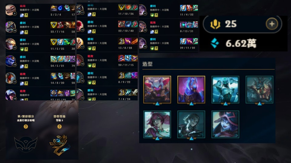 ☝️碎片:小小惡魔 崔絲塔娜、星河天鷹 冰鳥、人工智慧 麗珊卓、狂派機甲 納瑟斯、黑貓魔法使露璐、黑玫瑰假面伊澤瑞爾、超萌咖啡廳希維爾