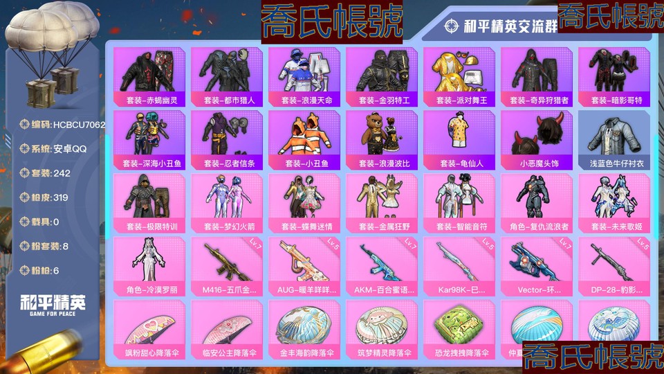 【OBHCBCU706242】熱力值:94809,8粉裝,6粉槍,23粉色戰備,242套裝,319槍械,376裝備,10滑翔尾翼,106降落傘;等級:Lv.71 歷史最高段位:絕世王牌18星 當前段位:卓越.王牌3星;王牌印記17次 卓越印記5次 傳奇印記3次 絕世印記2次; 【熱門品類】:套裝-赤蠍幽靈,套裝-都市獵人,套裝-浪漫天命,套裝-金羽特工,套裝-派對舞王,套裝-奇異狩獵者,套裝-暗影哥特,套裝-深海小丑魚,套裝-忍者信條,套裝-小丑魚,套裝-浪漫波比,套裝-龜仙人,小惡魔頭飾,淺藍色牛仔襯衣;【粉色套裝】:粉裝-極限特訓,粉裝-夢幻火箭,粉裝-蝶舞迷情,粉裝-金屬狂野,粉裝-智慧音符,角色-復仇流浪者,粉裝-未來歌姬,角色-冷漠羅麗;【粉色槍械】:M416-五爪金龍[7級],AUG-暖羊咩咩[5級],AKM-百合蜜語[7級],Kar98K-巳巳如意[5級],Vector-環太平洋[7級],DP-28-豹影疾電[5級];【粉色滑翔尾翼】:星之彼岸飛行器,提桶跑路飛行器,炫彩糖果飛行器;【粉色降落傘】:颯粉甜心降落傘,臨安公主降落傘,金豐海韻降落傘,築夢精靈降落傘,恐龍拽拽降落傘,仲夏莫吉托降落傘,百合蜜語降落傘,拂曉神騎降落傘,幻影戰神降落傘,粉色回憶降落傘,音爆索尼克降落傘,垂柳戲鴨降落傘,喜羊羊與灰太狼降落傘,極限特訓降落傘,星之彼岸降落傘,夢幻火箭降落傘,百萬伏特降落傘,炫彩糖果降落傘,未來歌姬降落傘,炫光之旅降落傘;【其他套裝】:套裝-特訓學院,套裝-獵鷹,套裝-青年教官,套裝-紅色運動,套裝-黃色運動,套裝-藍色運動,套裝-黃色伏地魔,套裝-白色伏地魔,套裝-黑色伏地魔,套裝-競技名士,套裝-深藍色名流,套裝-湖藍色名流,套裝-黃色名流,套裝-邊境牛仔,套裝-猛禽,套裝-長空猛禽,套裝-漫步者,套裝-雪鷹學院,套裝-藍色守護者,套裝-海島探路者,套裝-旭日情侶,套裝-冷焰舞者,套裝-西部牛仔,套裝-水銀刺客,套裝-特戰裝甲,套裝-貴族騎裝,套裝-迎春賜吉,套裝-春日漫步,套裝-龍騰端午,套裝-濱海假日,套裝-鷹眼刺客,套裝-冰凍風暴,套裝-冷酷挑戰者,套裝-完美偶像,套裝-人氣偶像,套裝-幻影武者,套裝-海濱突襲者,套裝-搖滾戰魂,套裝-特戰英豪,套裝-魅力單車,套裝-綺麗塗鴉,套裝-狂戰萌兔,套裝-堅韌舞者,套裝-競技達人朋克,套裝-超能勇士,套裝-狂沙舞者,套裝-破曉戰魂,套裝-幻世保衛者,套裝-森林遊獵者,套裝-都市魅力,套裝-榮耀,套裝-熱血青春,套裝-潮流炫酷,套裝-沙漠兵團,套裝-雪山精英,套裝-極地朋克,套裝-幻世戰舞者,套裝-清新檸檬,套裝-自由不朽樂隊,套裝-血色貴族,套裝-迅捷狂鯊,套裝-夏日傾情,套裝-甜蜜熊情侶,套裝-青澀時光,套裝-繽紛果語,套裝-AlanWalker,套裝-龍魂突擊隊,套裝-特種空勤,套裝-和平特警,套裝-風暴特警,套裝-冰川特警,套裝-青澀年華,套裝-格鬥先鋒,套裝-曠野奇兵,套裝-海上生明月,套裝-麻辣教官,套裝-東方飛龍,套裝-初雨海棠,套裝-SS4特訓,套裝-夢魘先生,套裝-萬聖娃娃,套裝-黑夜傳說,套裝-破蛋小黃雞,套裝-瘋狂小兔子,套裝-森林獵手,套裝-SS5特訓,套裝-聖誕大吉,套裝-好奇恐龍,套裝-軍械專家,套裝-格鬥專家,套裝-玲瓏飛花,套裝-精神漫遊,套裝-鶴鳴,套裝-霓虹街區,套裝-眾神之王,套裝-智慧之神,套裝-神秘黑貓,套裝-白熊同盟,套裝-萌黃之夏,套裝-夏日音浪,套裝-SS9特訓,套裝-風華少年志,套裝-探寶勇士,套裝-牛氣滿滿,套裝-白糯湯圓,套裝-潮流遊樂家,套裝-原初聖火,套裝-逆風勇士,套裝-戰術大師,套裝-SS12特訓,套裝-牛氣沖天,套裝-SS18特訓,套裝-耀粉歌者,套裝-飛行日記,套裝-夢起落英,套裝-冰爽海鹽,套裝-SS14特訓,角色-迪迦奧特曼,套裝-快樂星願,套裝-星夢暢遊,套裝-暴風機械師,套裝-SS17特訓,套裝-瑞龍福將,套裝-團圓交子,套裝-極樂追光,套裝-福星高照,套裝-豚鼠丹丹,套裝-虎虎生威吉莉,套裝-繽紛焰火,套裝-異彩先驅,套裝-霓虹極客,套裝-空投萌嘰,套裝-SS19特訓,套裝-極速競夢,套裝-飛馳魅影,套裝-音速流光,套裝-TT戰隊服,套裝-炫藍之夏,套裝-SS20特訓,套裝-獵夢紀元,套裝-甜心亞夢,套裝-虛音幻奏,套裝-SS21特訓,套裝-萌趣咩咩,套裝-嬌憨豬豬,套裝-夢幻奶油,套裝-玉兔迎春,套裝-SS22特訓,套裝-和煦暖陽,套裝-田園牧歌,套裝-輕風白浪,套裝-絢爛繁星,套裝-光之冒險,套裝-緋格組合,套裝-SS23特訓,套裝-神氣柴柴,套裝-懵萌河馬,套裝-妙紅點點,套裝-幻彩翩翩,套裝-王牌教練,套裝-檸萌假日,套裝-青玉碎影,套裝-SS24特訓,套裝-塗山之戀,套裝-SS25特訓,套裝-金戈鐵馬,套裝-驚鴻俠骨,套裝-錦衣飛揚,套裝-深海夢境,套裝-果汁能量,套裝-龍的傳人,套裝-冰河戰士,套裝-SS26特訓,套裝-漫遊都市,套裝-空島之星,套裝-雲魄琉璃,套裝-焰鷹斗篷,套裝-幽夜迷蹤,套裝-幻羽潛行,套裝-SS27特訓,套裝-戀語絨絨,套裝-SS28特訓,角色-冰公主,套裝-海鹽綿綿冰,套裝-蝶變,套裝-創世追獵,套裝-SS29特訓,套裝-異域銀裝,套裝-星途旅人,套裝-旋風靈鼠,套裝-SS30特訓,套裝-青團波波,角色-絳羽幽主,套裝-糖糖葫蘆,套裝-SS31特訓,套裝-魚淵荷華,套裝-燕燕於飛,套裝-智謀強哥,套裝-紫幽夢,套裝-粉戀花,套裝-SS33特訓,套裝-雲朵鵝,套裝-巳巳如意,套裝-SS32特訓,套裝-彩虹兔,套裝-藍冰羽,套裝-頂瓜瓜,套裝-雪絨豹,套裝-大橘大利,套裝-霓虹熱舞,套裝-炫彩糖果,套裝-元氣之夢,套裝-SS34特訓,套裝-擎蒼青焰,套裝-朱霞熾焰,套裝-遊樂,套裝-凌霄紫焰,套裝-薄荷星砂,套裝-SS35特訓,套裝-粉黛蘭香,套裝-SS36特訓,套裝-萌雞速遞;其他槍械:M762-瑞龍福將,M762-天降萌嘰,M762-詭娃娃,M762-彩虹符號,M762-