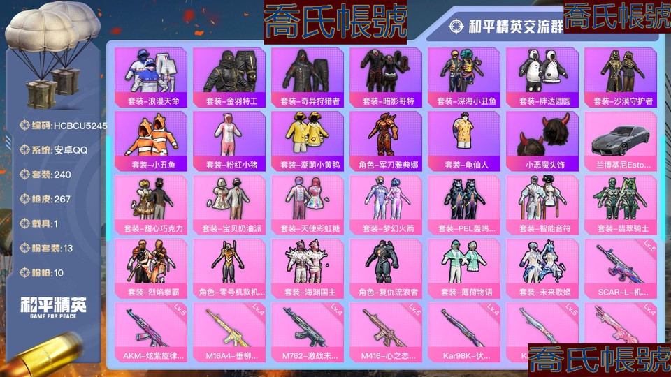 【OBHCBCU524542】熱力值:99450,13粉裝,10粉槍,1載具,12粉色戰備,240套裝,267槍械,356裝備,9滑翔尾翼,88降落傘;等級:Lv.76 歷史最高段位:卓越王牌10星 當前段位:超級.王牌2星;王牌印記16次 卓越印記3次;地鐵滿天賦; 【熱門品類】:套裝-浪漫天命,套裝-金羽特工,套裝-奇異狩獵者,套裝-暗影哥特,套裝-深海小丑魚,套裝-胖達圓圓,套裝-沙漠守護者,套裝-小丑魚,套裝-粉紅小豬,套裝-潮萌小黃鴨,角色-軍刀雅典娜,套裝-龜仙人,小惡魔頭飾;【粉色套裝】:粉裝-甜心巧克力,粉裝-寶貝奶油派,粉裝-天使彩虹糖,粉裝-夢幻火箭,粉裝-PEL轟鳴競夢者,粉裝-智慧音符,粉裝-翡翠騎士,粉裝-烈焰拳霸,角色-零號機款機體服,粉裝-海淵國主,角色-復仇流浪者,粉裝-薄荷物語,粉裝-未來歌姬;【粉色槍械】:SCAR-L-機甲封神[5級],AKM-炫紫旋律[5級],M16A4-垂柳戲鴨[4級],M762-激戰未來[4級],M416-心之戀語[5級],Kar98K-伏魔團[4級],Kar98K-巳巳如意[5級],Mk14-櫻桃泡泡[4級],UMP45-玉魂晶魄[4級],DP-28-豹影疾電[5級];【粉色載具】:蘭博基尼Estoque(銀翼灰);【粉色滑翔尾翼】:炫彩糖果飛行器,神秘黑貓飛行器;【粉色降落傘】:四聖煥新降落傘,神秘黑貓降落傘,甜心寶貝降落傘,繁花小夜曲降落傘,垂柳戲鴨降落傘,星之彼岸降落傘,炫彩糖果降落傘,夢幻火箭降落傘,碧影閃光降落傘,齊天大聖降落傘;【其他套裝】:套裝-特訓學院,套裝-紅色運動,套裝-黃色運動,套裝-藍色運動,套裝-白色伏地魔,套裝-黑色伏地魔,套裝-競技名士,套裝-深藍色名流,套裝-酒紅色名流,套裝-湖藍色名流,套裝-黃色名流,套裝-伏擊者,套裝-遊獵者,套裝-長空猛禽,套裝-競技勇士朋克,套裝-黎明保衛者,套裝-沙漠探路者,套裝-旭日情侶,套裝-六六大吉,套裝-冷焰舞者,套裝-剛毅裁決者,套裝-特戰裝甲,套裝-戰地菁英,套裝-貴族騎裝,套裝-戰地督導,套裝-突襲者,套裝-黃色格鬥者,套裝-灰色格鬥者,套裝-甜蜜告白,套裝-春日漫步,套裝-潮流先鋒,套裝-濱海假日,套裝-暗黑騎手,套裝-沙漠狂蠍,套裝-沙漠毒蛇,套裝-鷹眼刺客,套裝-冰凍風暴,套裝-完美偶像,套裝-幻影武者,套裝-海濱突襲者,套裝-特戰英豪,套裝-街頭潮人,套裝-藍彩潮人,套裝-神秘領域,套裝-怒火燎原,套裝-決勝時刻,套裝-魅力單車,套裝-綺麗塗鴉,套裝-耀眼新星,套裝-狂戰萌兔,套裝-雪山征服者,套裝-堅韌舞者,套裝-競技達人朋克,套裝-朋克治安官,套裝-夜鶯強襲者,套裝-都市漫遊者,套裝-野性戰心,套裝-野性戰魂,套裝-狂沙舞者,套裝-潮流炫酷,套裝-沙漠兵團,套裝-叢林獵人,套裝-SS2特訓,套裝-雪山精英,套裝-酷潮明星,套裝-傳奇偵探,套裝-極地朋克,套裝-幻世戰舞者,套裝-金耀舞者,套裝-幽冥伯爵,套裝-弄潮海豚,套裝-迅捷狂鯊,套裝-呆萌鐵蟹,套裝-甜蜜熊情侶,套裝-青澀時光,套裝-繽紛果語,套裝-AlanWalker,套裝-冰川特警,套裝-青澀年華,套裝-極速紅龍,套裝-格鬥先鋒,套裝-海上生明月,套裝-麻辣教官,套裝-夢魘先生,套裝-黑夜傳說,套裝-萌神柯基,套裝-破蛋小黃雞,套裝-瘋狂小兔子,套裝-森林獵手,套裝-深藍冒險家,套裝-迷域探索者,套裝-機械英豪,套裝-機械征服者,套裝-SS5特訓,套裝-聖誕大吉,套裝-熔岩使者,套裝-凜冬戰士,套裝-好奇恐龍,套裝-裁決冥王,套裝-金鼠迎春,套裝-軍械專家,套裝-北國孤狼,套裝-SS6特訓,套裝-拳皇97八神庵,套裝-熾焰拳師,套裝-格鬥專家,套裝-薔薇魔法師,套裝-躍動心情,套裝-SS7特訓,套裝-黑色刀鋒,套裝-核芯基因,套裝-精神漫遊,套裝-鶴鳴,套裝-霓虹街區,套裝-激萌羅小黑,套裝-五號元素,套裝-SS10特訓,套裝-SS8特訓,套裝-眾神之王,套裝-智慧之神,套裝-大橘為重,套裝-白熊同盟,套裝-萌黃之夏,套裝-擊劍大師,套裝-人魚之吻,套裝-深海來使,套裝-夏日音浪,套裝-SS9特訓,套裝-風華少年志,套裝-白月香洋裝,套裝-頑皮玉兔,套裝-抹茶蜜豆,套裝-神奈川衝浪裡,套裝-探寶勇士,套裝-輝星之火,套裝-TJB戰隊服,套裝-牛氣滿滿,套裝-韶華初心,套裝-SS11特訓,套裝-青春冒險家,套裝-潮流遊樂家,套裝-原初聖火,套裝-逆風勇士,套裝-萌趣顏糰子,套裝-特種顏糰子,套裝-SS12特訓,套裝-牛氣沖天,套裝-SS18特訓,套裝-鐳射皇者,套裝-銀白舞王,套裝-迅捷之星,套裝-治癒之星,套裝-科技之星,套裝-飛行日記,套裝-SS13特訓,套裝-光影夢想家,套裝-SS14特訓,角色-迪迦奧特曼,套裝-吉莉禮服,角色-零款戰鬥服,角色-薰款戰鬥服,套裝-SS15特訓,套裝-SS16特訓,套裝-暴風機械師,套裝-時空追擊者,套裝-暗夜魅影,套裝-暗夜傀儡,角色-英勇保護者,套裝-SS17特訓,套裝-醒獅騰龍,套裝-瑞龍福將,套裝-團圓交子,套裝-炫光向陽,套裝-福星高照,套裝-遺落祭司,套裝-豚鼠丹丹,套裝-虎虎生威吉莉,套裝-異彩先驅,套裝-霓虹極客,套裝-空投萌嘰,套裝-SS19特訓,套裝-飛馳魅影,套裝-音速流光,套裝-SS20特訓,套裝-甜心亞夢,套裝-虛音幻奏,套裝-SS21特訓,套裝-暖心熊熊,套裝-萌趣咩咩,套裝-嬌憨豬豬,套裝-夏雨遊龍,套裝-玉兔迎春,套裝-SS22特訓,套裝-緋格組合,套裝-SS23特訓,套裝-王牌教練,套裝-青玉碎影,套裝-SS24特訓,套裝-塗山之戀,套裝-SS25特訓,套裝-龍的傳人,套裝-戀語絨絨,套裝-異域銀裝,套裝-SS31特訓,套裝-SS33特訓,套裝-SS32特訓,套裝-頂瓜瓜,套裝-大橘大利,套裝-炫彩糖果,玩偶服-喜羊羊,套裝-SS34特訓,套裝-薄荷星砂,套裝-SS35特訓,套裝-SS36特訓,套裝-萌雞速遞;其他槍械:SCAR-L-彩虹符號,SCAR-L-碧影閃光,SCAR-L-夜燈,SCAR-L-烏木金紋,SCAR-L-紅色方程式,SCAR-L-炫彩節奏,SCAR-L-