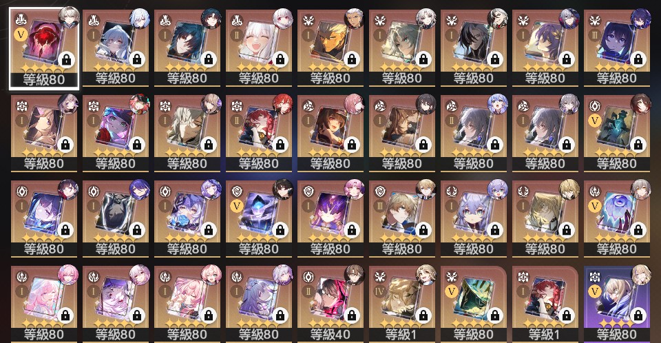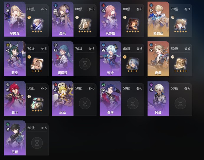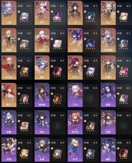 黃泉6+1 遐蝶3+1 大 黑塔2+1 昔蓮2+1 長夜月2+1 風0+1 海瑟音0+1 提寶0+0 阿格萊雅1+0 亂破0+1 波提歐0+1 流螢0+0 知更鳥1+0 黑天鵝0+1 花火1+1 黑霄1+1 忘歸人0+0 雲璃0+0 鏡流4+1 景元0+1 紅a1+1 銀狼0+0 卡芙卡0+0 藤荒0+0 真理0+1 阮梅2+1 霍霍0+0 白露2+1 符1+1 刃3+1 羅剎0+1 克拉拉4+2 希兒4+3 布洛妮婭5+1 瓦爾特3+2 姬子4+3 傑帕德3+3 彥卿0+4