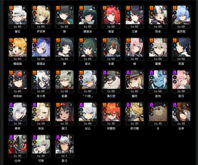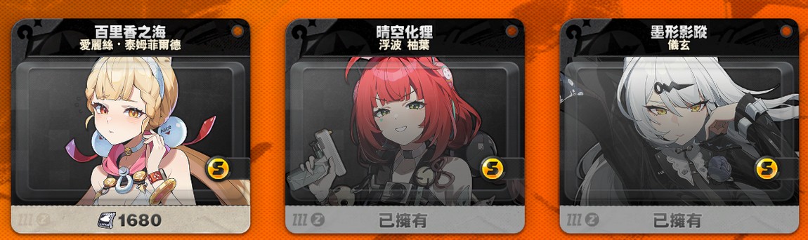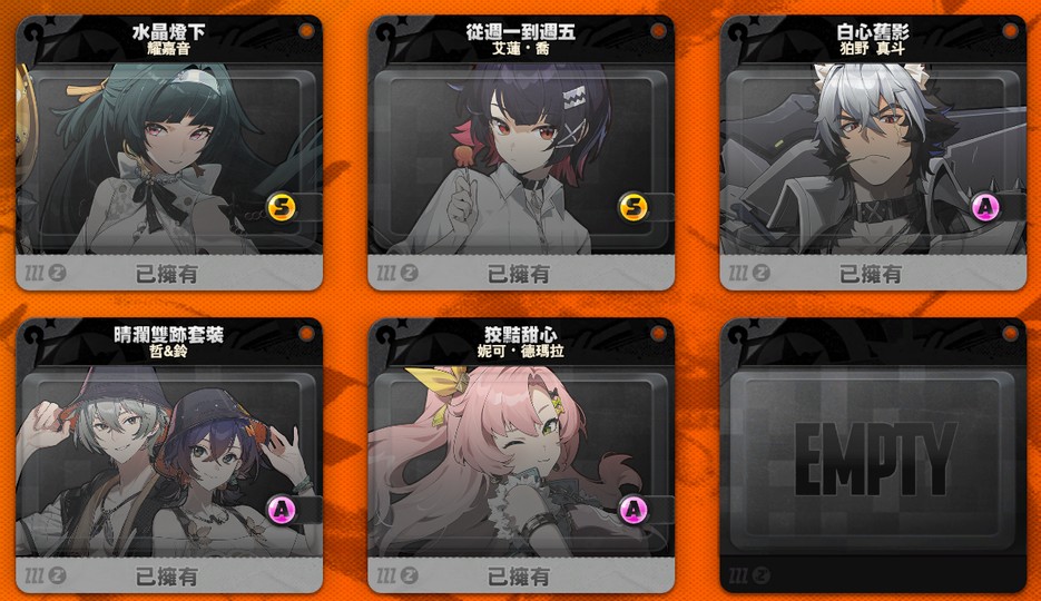 儀玄6+1 伊芙琳4+1 雅3+1 耀嘉音1+1 柚葉2+1 艾蓮1+1 琉音1+1 盧西婭1+1 橘福福0+0 薇薇安0+1 簡0+1 青衣0+1 朱鳶0+0 柳1+1 麗娜5+1 悠真0+0 格莉絲3+1 萊卡恩1+1 凱撒0+0 11號2+2 柯蕾妲1+0 貓又2+2