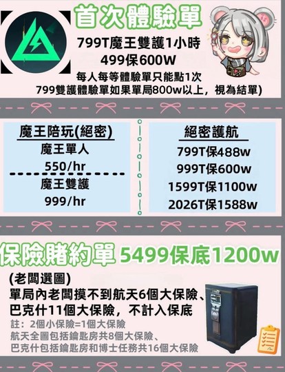 | 代打 一人2799T(損耗2000W) 包車3人6999T(損耗2000W) |