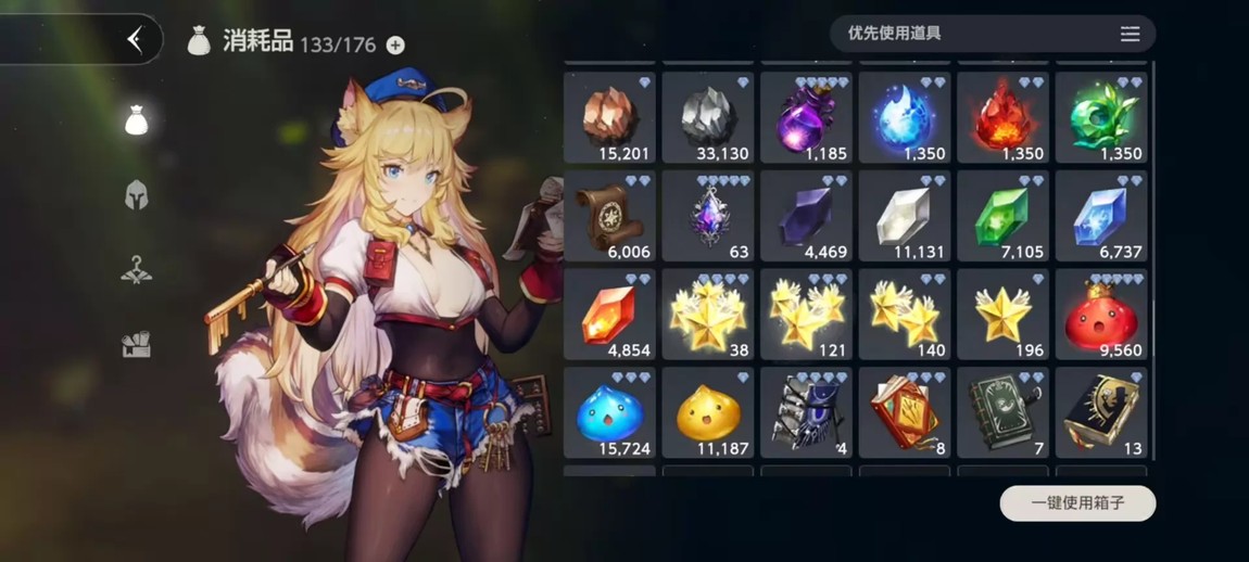 背包資源非常多還有130多萬粉塵,1100多遠古水晶,63顆女神之淚
