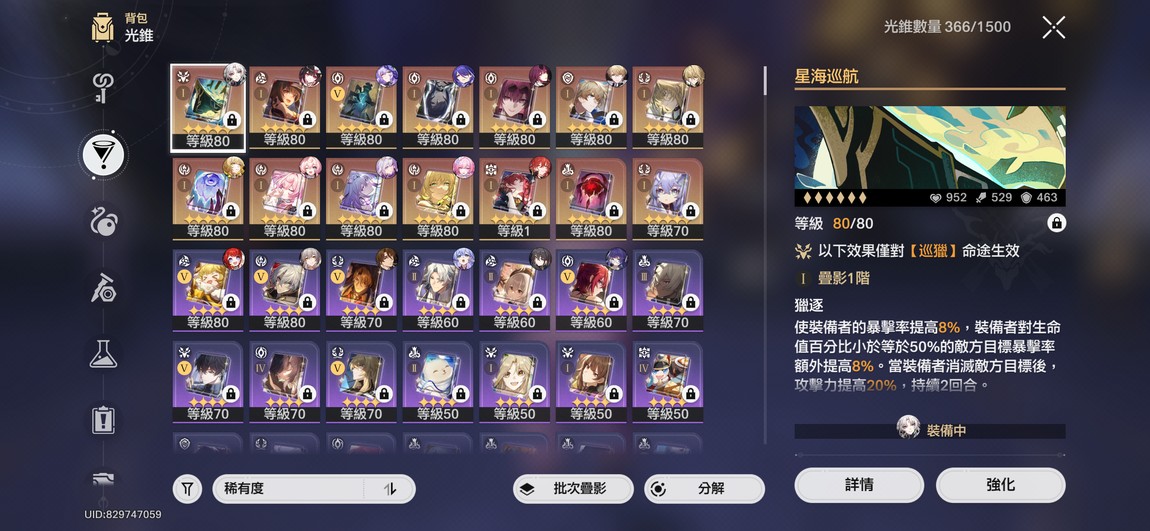 本帳號許多資源未用,還有很多很多可以拿,地圖上還有超多寶箱沒搜完,目前還能換一隻五星角色,光錐差一個光錐碎憶就能兌換。