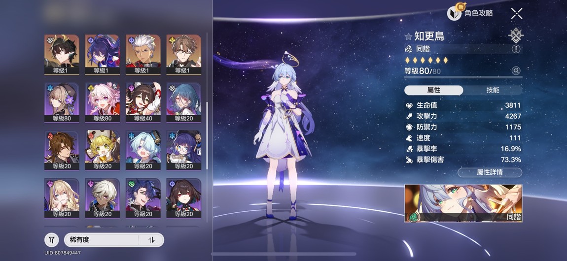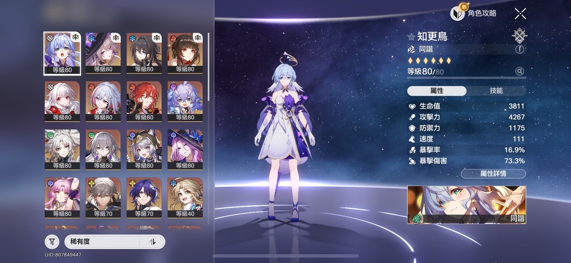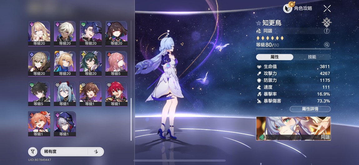 角色.專武如圖,生日未設,主線印象中打完匹諾康尼而已,懶得看,google可整組給,當初考慮到後續可能賣帳新辦的,可提供氪金紀錄,帳號詳情可私訊,回覆時間不固定