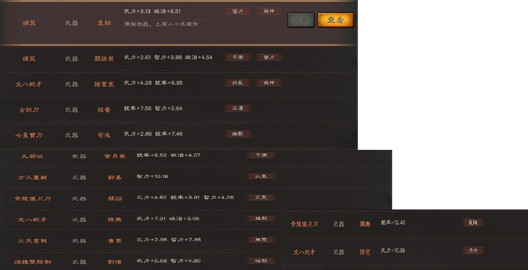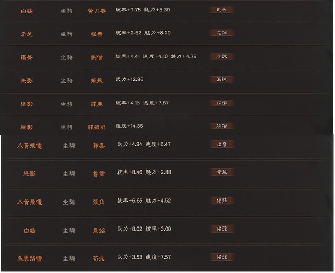 2踩踏 3好學 3靈動 2援助 出奇 雄烈 昭烈 華服 龍驤 虎峙 無雙 武聖 天公 等等