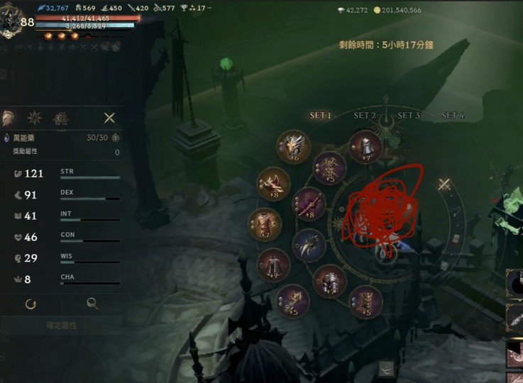 刻印紅裝:+3怨恨耳環(11)+2裂痕耳環(11)+3鬥士項鍊(21)+3阿爾戒指(11)