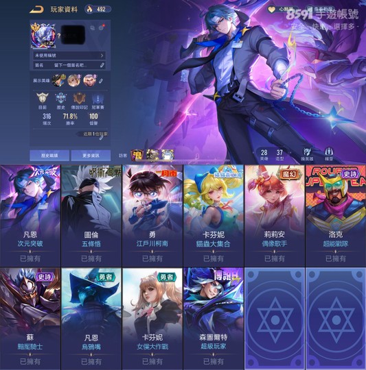 【純FB帳、鉑金、V7、28英、37造】高勝次元凡恩五條悟柯男超級玩家咖波