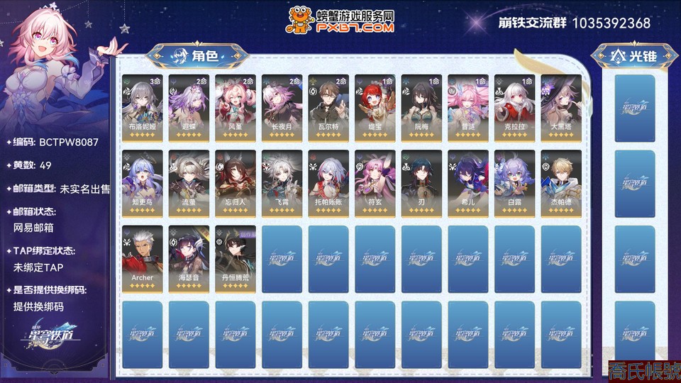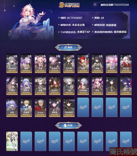【OBBCTPW808742】70級,男主,49黃,五星角色:3命布洛妮婭,2命風堇,2命遐蝶,2命長夜月,2命瓦爾特,1命緹寶,1命昔漣,1命克拉拉,1命阮梅,風堇,遐蝶,緹寶,大黑塔,知更鳥,阮梅,流螢,忘歸人,飛霄,託帕賬賬,符玄,刃,希兒,布洛妮婭,白露,傑帕德,瓦爾特,克拉拉,Archer,海瑟音,長夜月,丹恆騰荒,昔漣;服飾:春日手信;【未實名】記憶隊昔漣11其他21,有昔漣弓皮,號上還有一個金靈和4個光錐碎片可以自選5星角色和專武