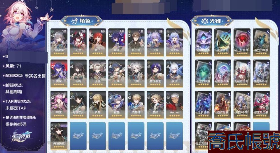 【OBBCTPW452742】70級,女主,74黃,星軌專票:1172,【未實名】星穹鐵道亞服退遊18萬星穹1130專票74黃。1121專票+22角色墊+20光錐墊, 21花火01黃泉11希兒 飛霄雲璃知更鳥流螢阮梅鏡流符玄飲月銀狼羅剎紅a藤荒真理 22限定, 42鴨鴨11白露 10姬子 01傑帕德 11瓦爾特 彥卿 疊二無可取代的東西 19常駐, 六張疊五黑塔 42黑塔卷三月七皮膚,地圖寶箱全收集1332成就, 四五百+15遺器,+10速及以上的有七個,+9速十二個,169速風套溫瓦克,詞條中5-9次的五十多,六張舞舞舞 97燃料,76自塑,2金靈2干涉2重投 全勤兩年多自玩歐皇號非科技送,材料3200經驗書,1800光錐,1600遺器,33000遺器殘骸 畢業紅a花火配隊混沌兩t,末日3300,虛構2600,退遊出號,906累登送Outlook