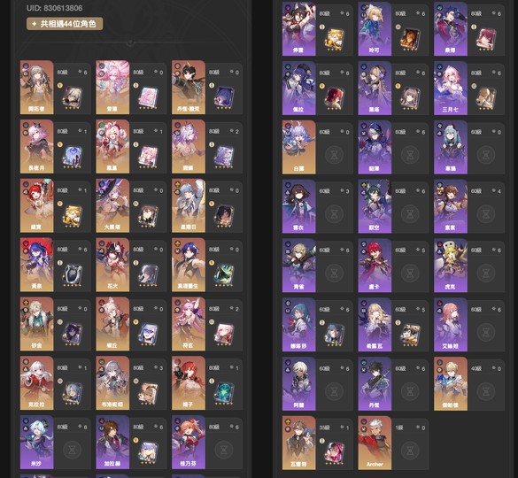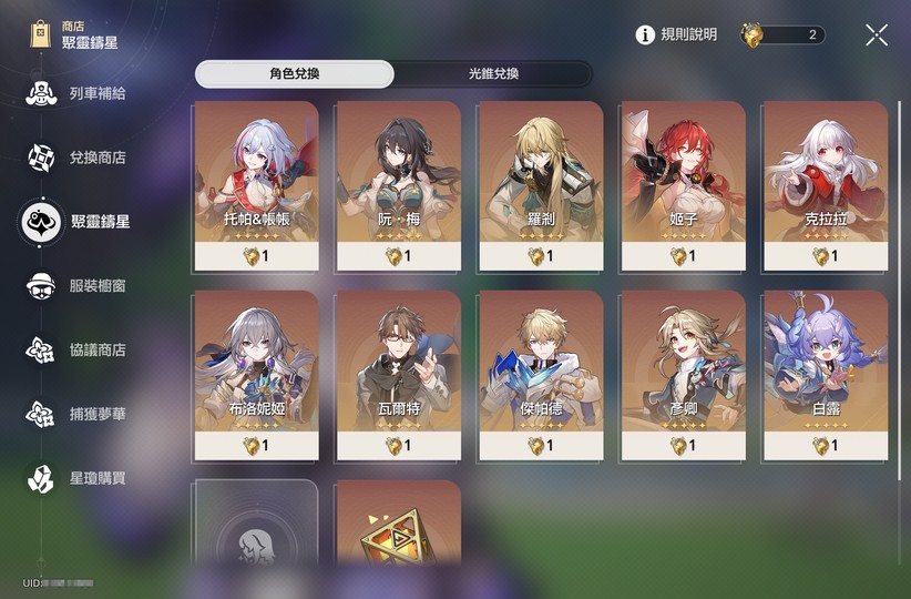 已練5星:61黃泉+21遐蝶+11風堇+10長夜月+11緹寶+01昔漣+00盾丹+00大黑塔+00星期日+00花火+00真理+00砂金+00椒丘+20符玄+10克拉拉+31布洛妮婭+10姬子