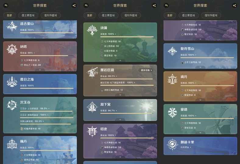 大世界探索度除了納塔90%;沉玉谷、岩層巨源差一點,其餘探索度全滿。