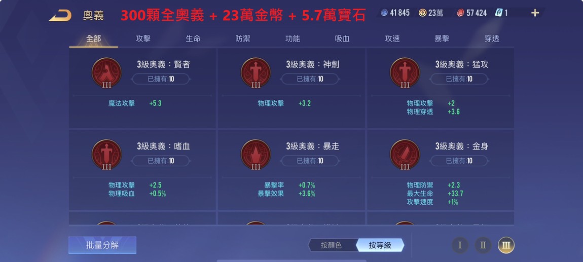 全奧義300顆、金幣23萬、寶石5.7萬、紫標