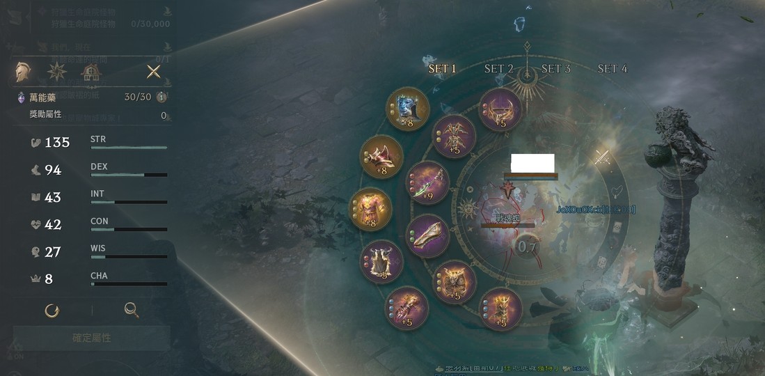 【商城裝備】:+8燦爛鬥士T、+8燦爛水龍面、+8燦爛力肩甲、【徽章】:+10徽章 勇猛(紫)、+9徽章-守護(紫)、+6徽章-智慧(紫)【標幟】:+9大將軍的標幟(紅)、+7奴隸標幟(紅)、+5龍的標幟(綠)【符石】:+2貫穿符石、+4祝燦爛的力量符石