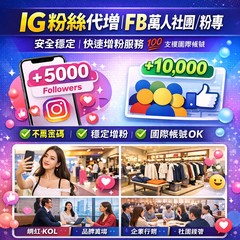 本商品提供 Instagram 粉絲代增 以及 Facebook 萬人社團/粉專粉絲增長服務,採用 安全穩定機制,非機器暴衝,適合長期經營帳號、品牌塑造、商業用途。