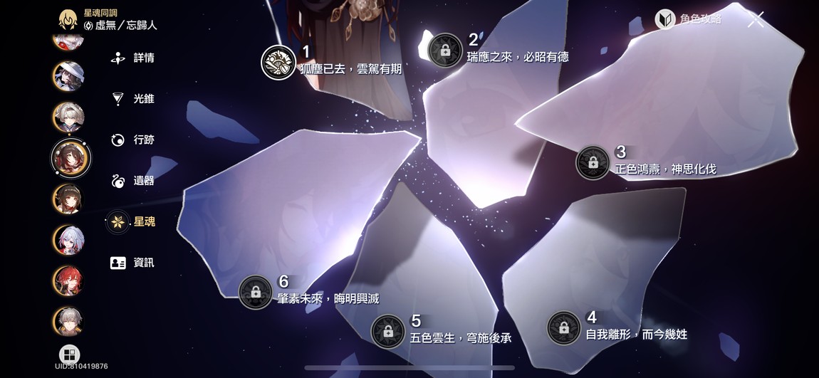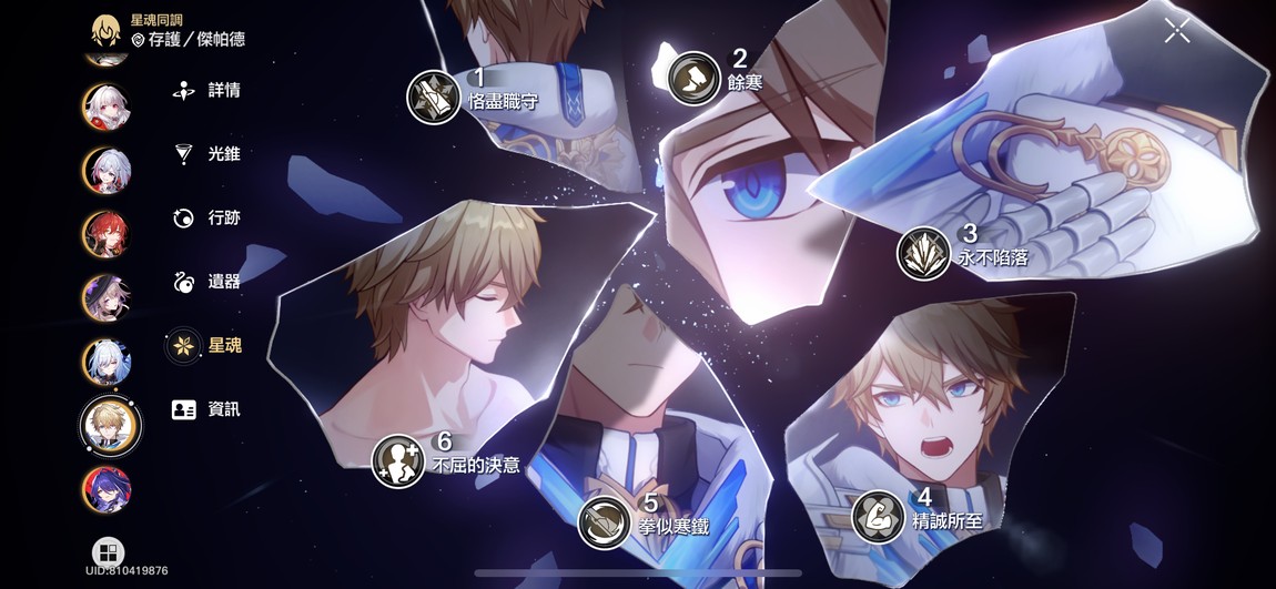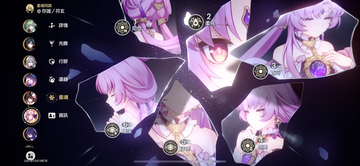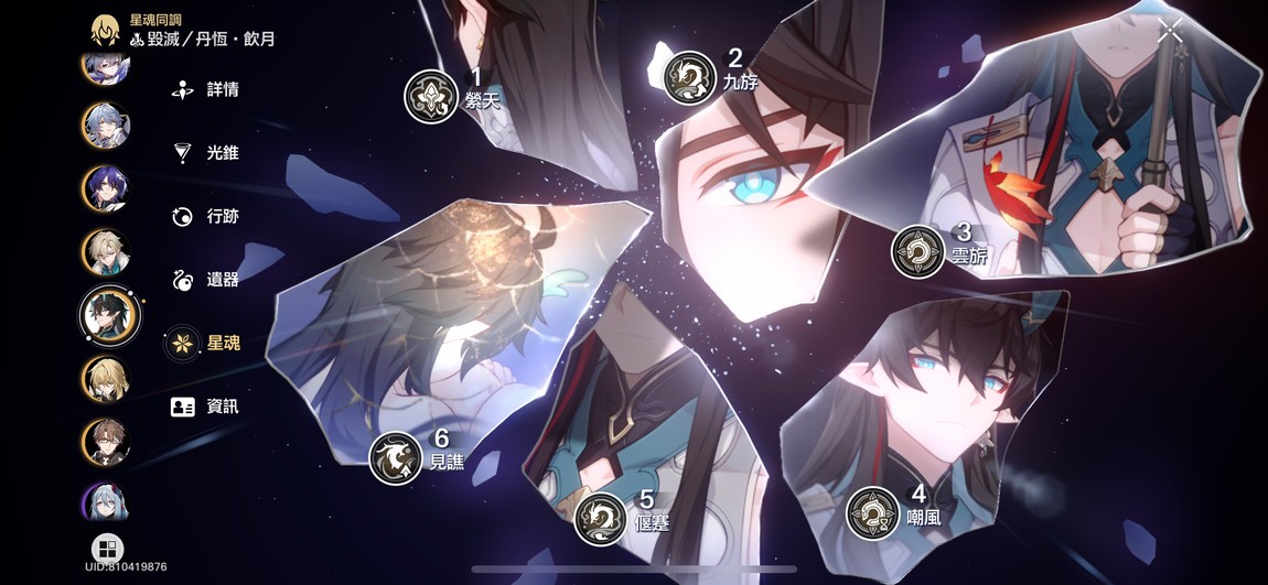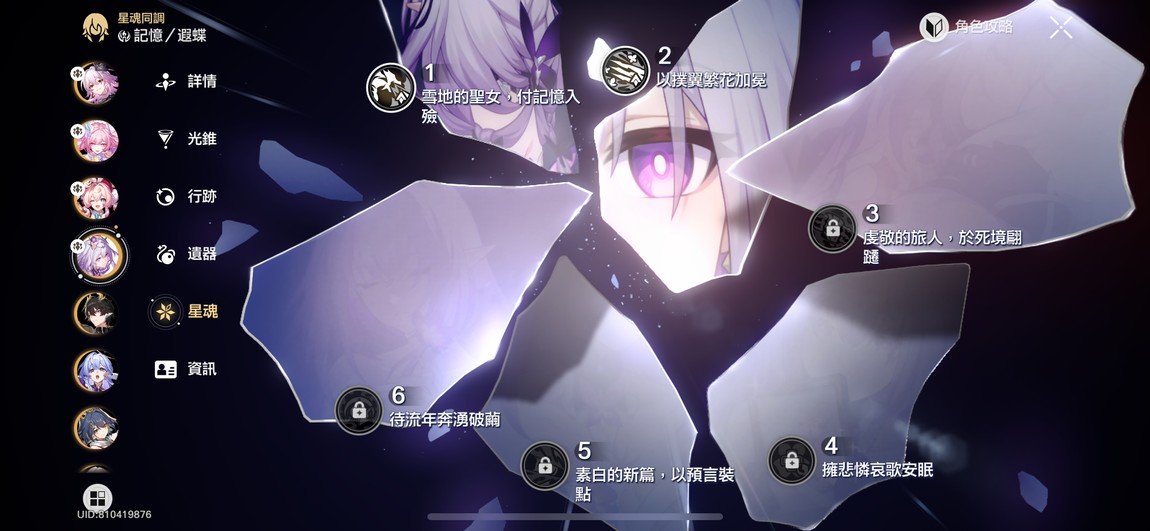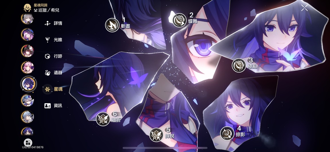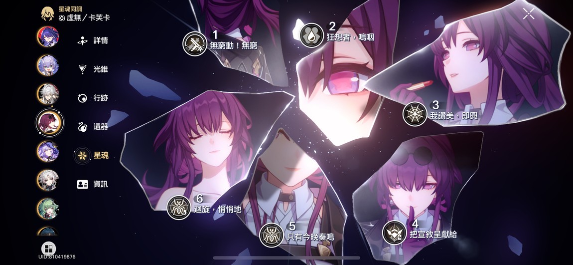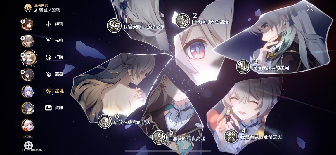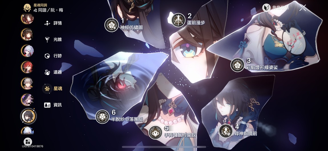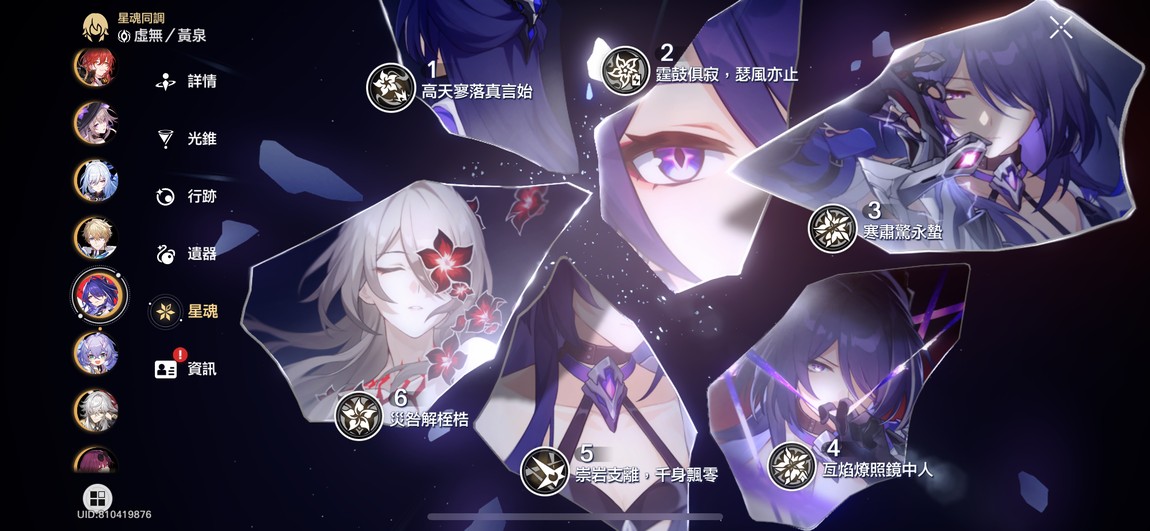 遐蝶、昔漣、風瑾、長夜月、騰荒、知更鳥、雲璃、克拉拉、大理花、流螢、望歸人、靈紗、托帕、姬子、大黑塔、阮梅、鏡流、傑帕德、黃泉、白露、景元、卡芙卡、黑天鵝、飛霄、霍霍、刃、布洛妮婭、提寶、翡翠、花火、符玄、希兒、紅A、銀狼、星期日、真理醫生、沙金、丹恆飲月、羅剎、瓦爾特、彥卿