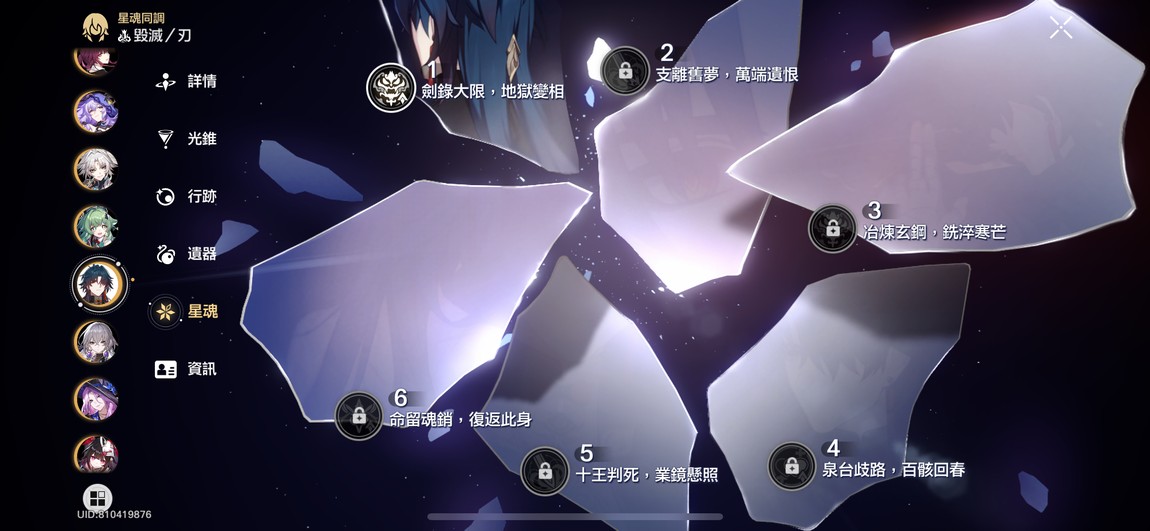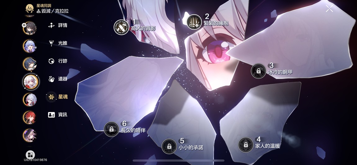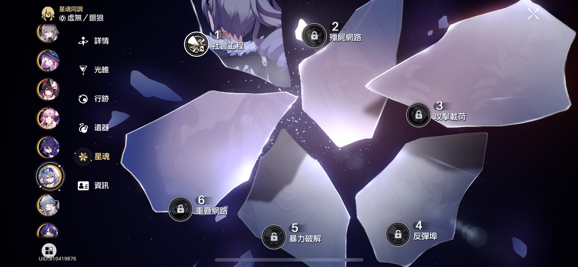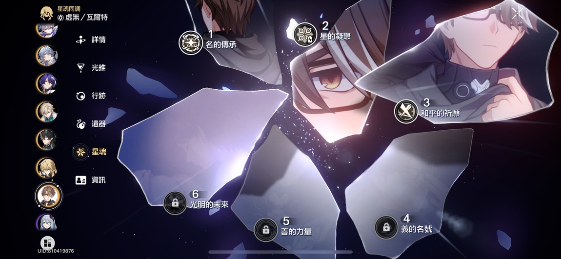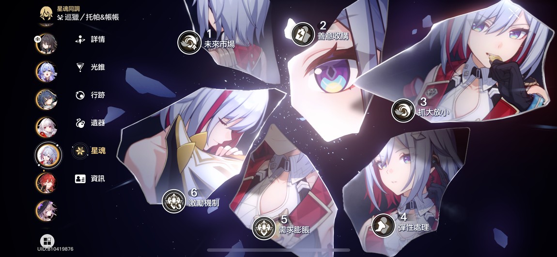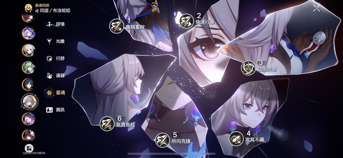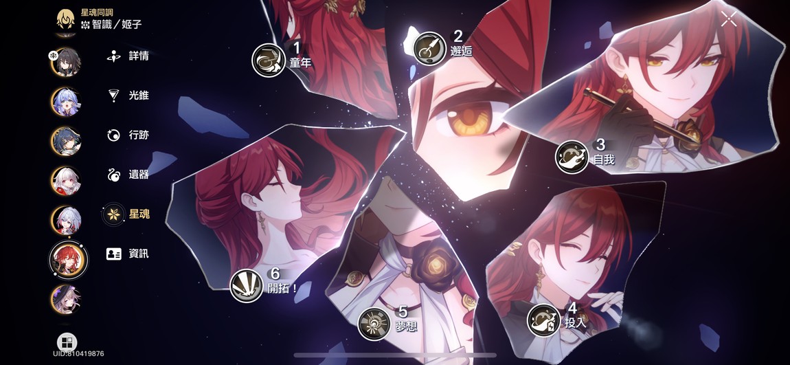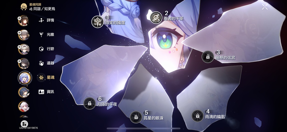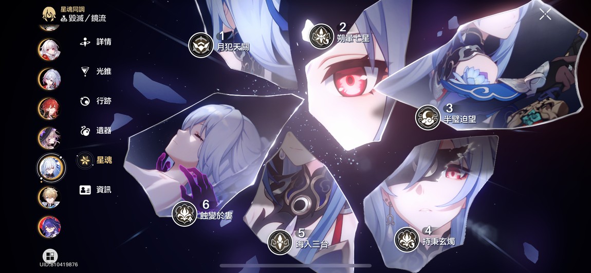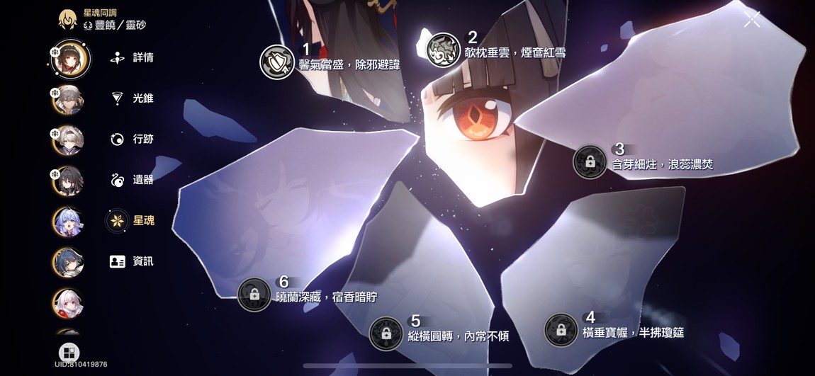 遐蝶、昔漣、風瑾、長夜月、騰荒、知更鳥、雲璃、克拉拉、大理花、流螢、望歸人、靈紗、托帕、姬子、大黑塔、阮梅、鏡流、傑帕德、黃泉、白露、景元、卡芙卡、黑天鵝、飛霄、霍霍、刃、布洛妮婭、提寶、翡翠、花火、符玄、希兒、紅A、銀狼、星期日、真理醫生、沙金、丹恆飲月、羅剎、瓦爾特、彥卿