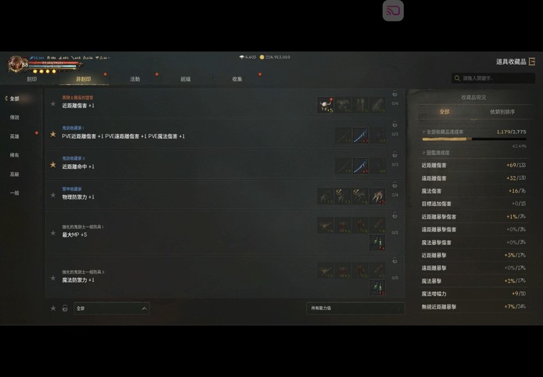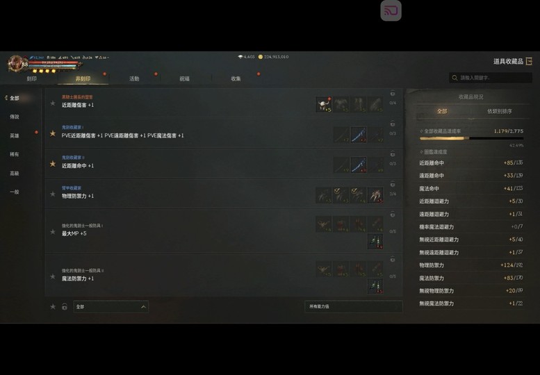 【總收藏】: 42.53% (近傷命69/85、物防124)