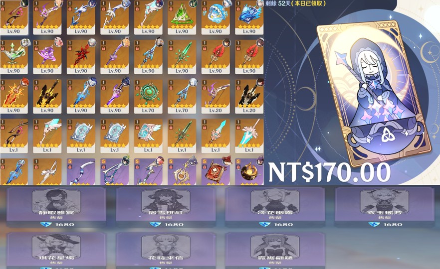 【女、60等、38金角、34金武】杜林 奈芙爾 菈烏瑪 夜蘭6+1 雷神6+1 火神2+1 水神2+1 草神6+1